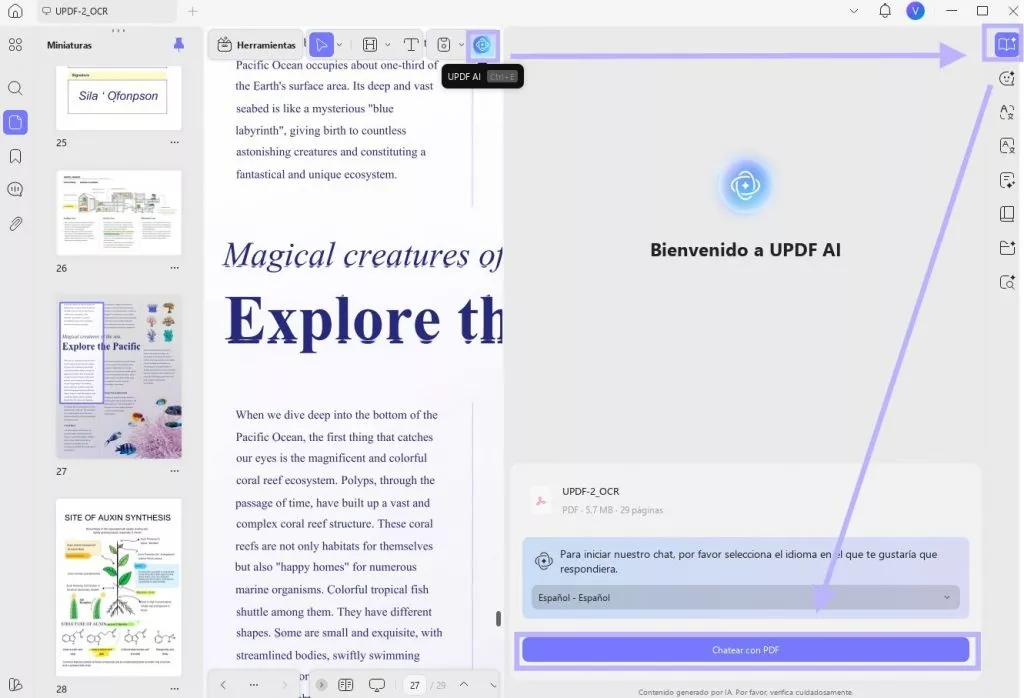 Paso 2. Selecciona el icono UPDF AI situado en la esquina inferior derecha de la aplicación UPDF para abrir el chat AI.