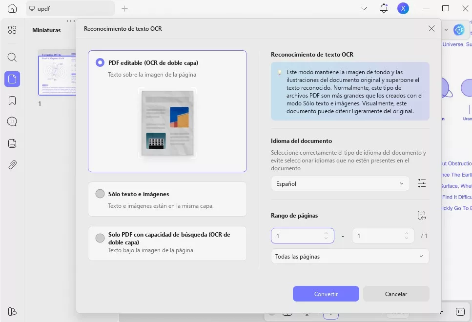 Una vez que hayas accedido al archivo PDF escaneado con UPDF, mueve el cursor a "Herramientas" y pulsa la opción "OCR". En la sección "Tipo de documento", mantén la opción "PDF con capacidad de búsqueda". A continuación, continúa ajustando el "Diseño", el "Rango de páginas", el "Idioma del documento" y la "Resolución de imagen". Puede pulsar el icono "Engranaje" para realizar más ajustes y el botón "Convertir".