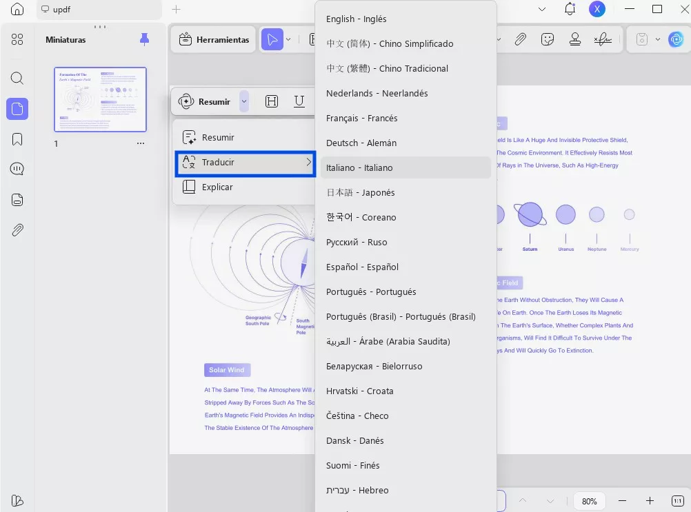 En el "modo lector", puede traducir rápidamente un texto específico seleccionándolo con el cursor. Al hacerlo, aparecerá un menú emergente sobre el texto en el que encontrará la función "UPDF AI". En el menú desplegable de UPDF AI, pase el cursor por encima de la opción integrada "Traducir" para acceder a una lista de idiomas en el menú ampliado. Seleccione cualquiera de los idiomas y el texto se traducirá al instante.