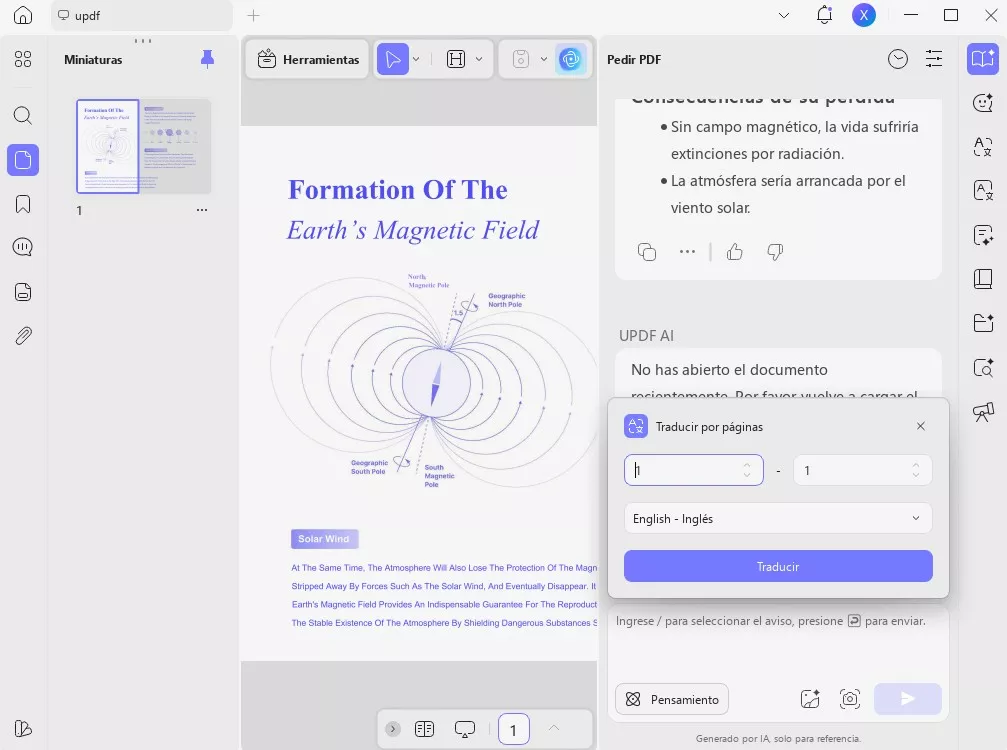 UPDF AI es una herramienta de inteligencia artificial que funciona en línea, en Windows, Mac, Android e iOS. Es muy fácil de usar. Te permite traducir páginas personalizadas o todas las páginas al idioma que necesites. Además, puedes traducir el contenido específico de una página a cualquier idioma que necesites.