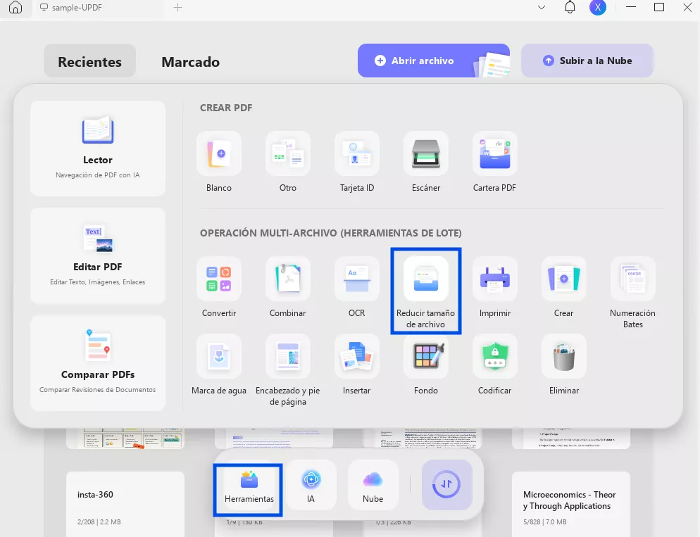 Paso 1: En primer lugar, descargue e instale el software UPDF en su PC/portátil mediante el botón que aparece a continuación. Una vez hecho esto, ejecútelo y, en la interfaz principal, localice y seleccione la pestaña "Herramientas". Desde allí, navegue hasta la sección "Operación con varios archivos (proceso por lotes)". Dentro de ella, haga clic en «Reducir tamaño de archivo»: esta es la función que utilizará para comprimir varios archivos PDF.