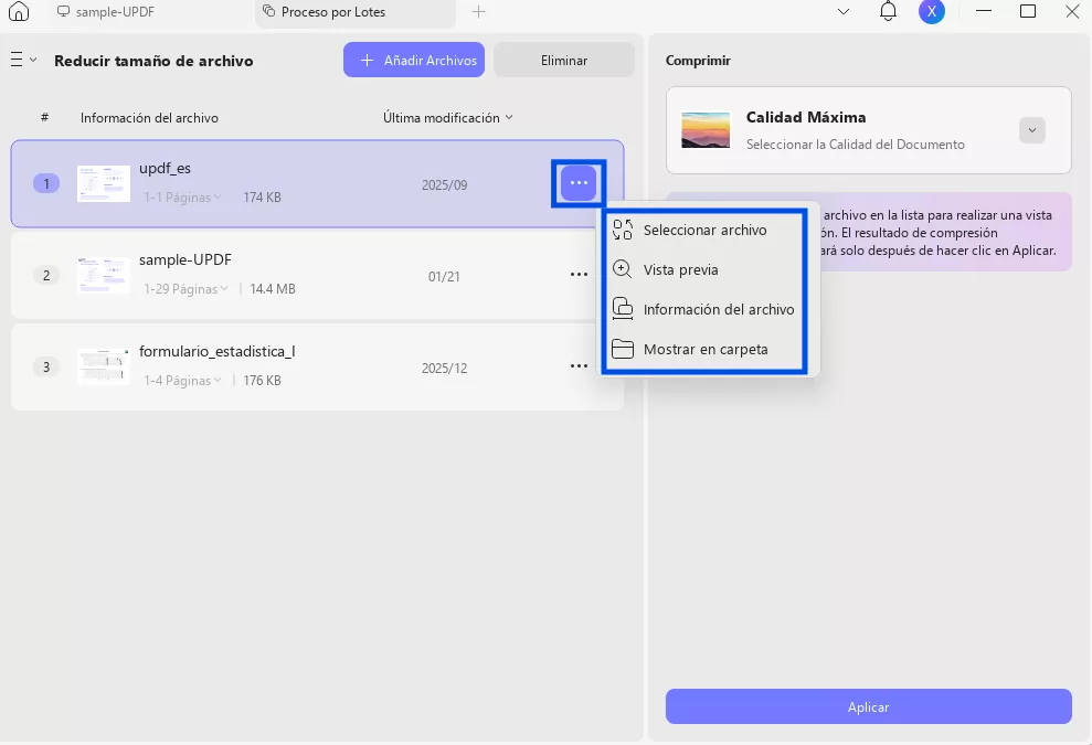 Hacer clic en el icono de tres puntos ("...") de la fila del archivo para abrir un menú con opciones como "Seleccionar archivo", "Vista previa", "Información del archivo" y "Mostrar en carpeta".