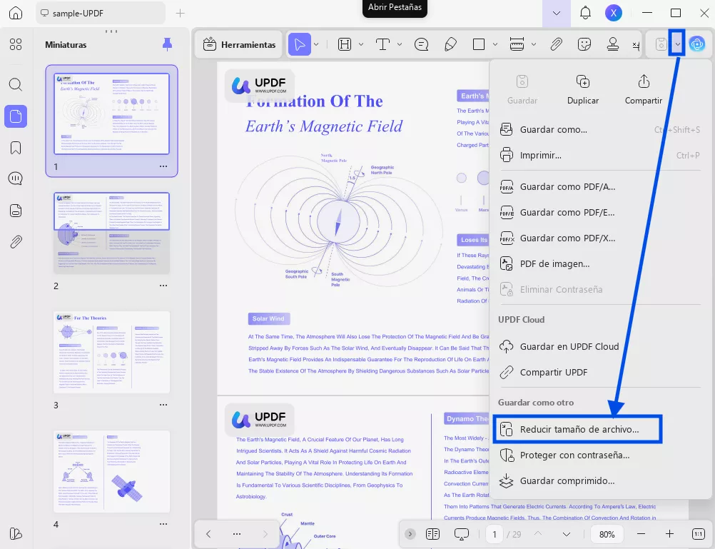 Una vez importado el archivo, haz clic en la flecha desplegable situada junto al icono "Guardar" en la esquina superior derecha, expande la lista desplegable y selecciona "Reducir tamaño del archivo".