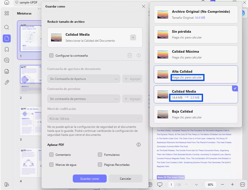 - A la derecha: una sección titulada "Comprimir", donde puede elegir la calidad del documento para la compresión (por ejemplo, máxima calidad, alta calidad, etc.).