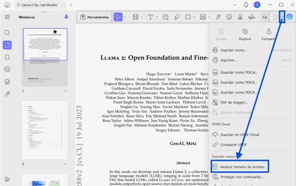 Para comprimir el archivo PDF, haga clic en el icono estrecho situado junto a "Guardar "y seleccione "Reducir tamaño del archivo".