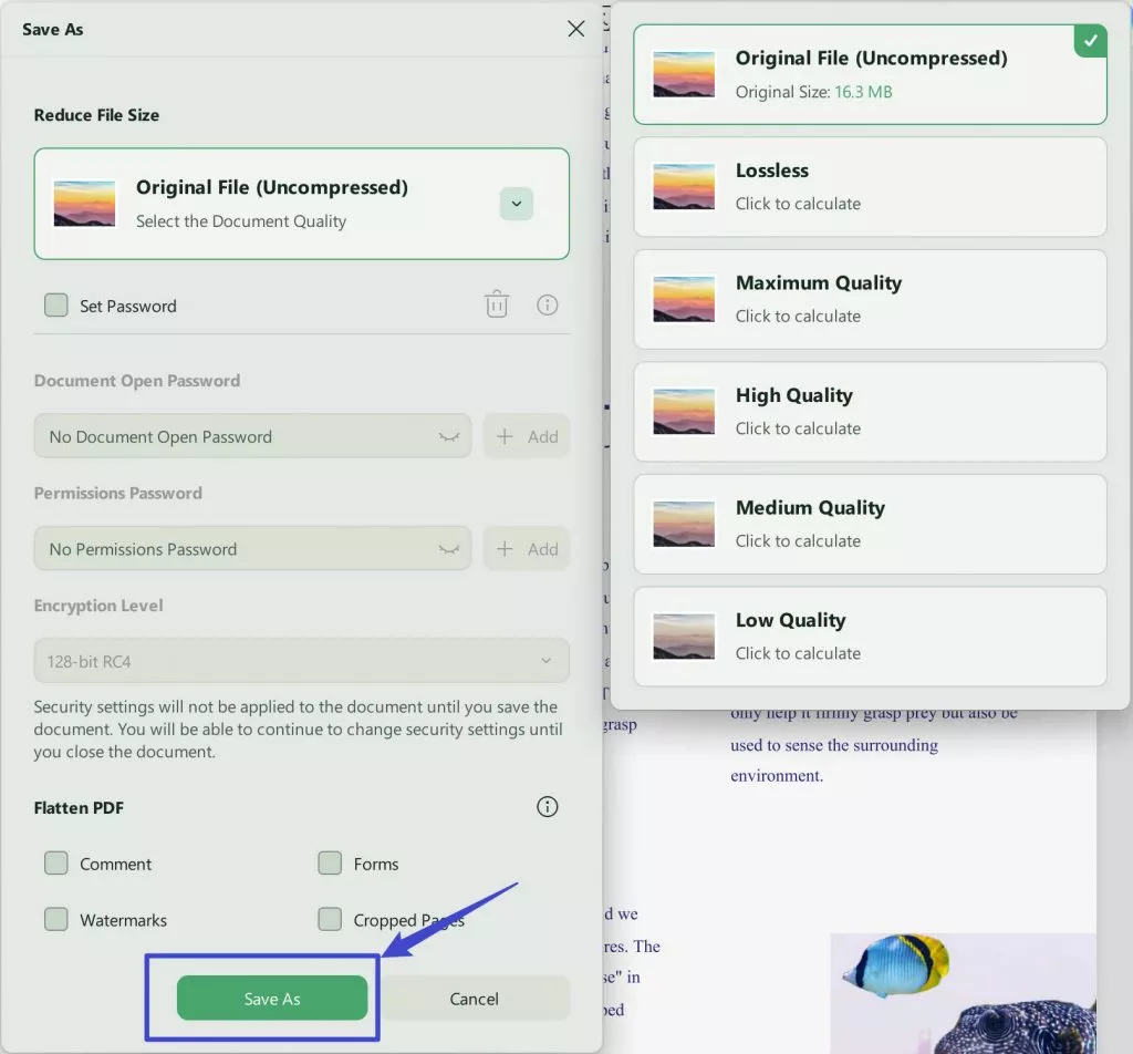 Una vez seleccionado el nivel de compresión deseado, haga clic en "Guardar como" para comprimir el archivo. UPDF le permitirá seleccionar la carpeta y el nombre del archivo para guardar la nueva versión más pequeña del documento.