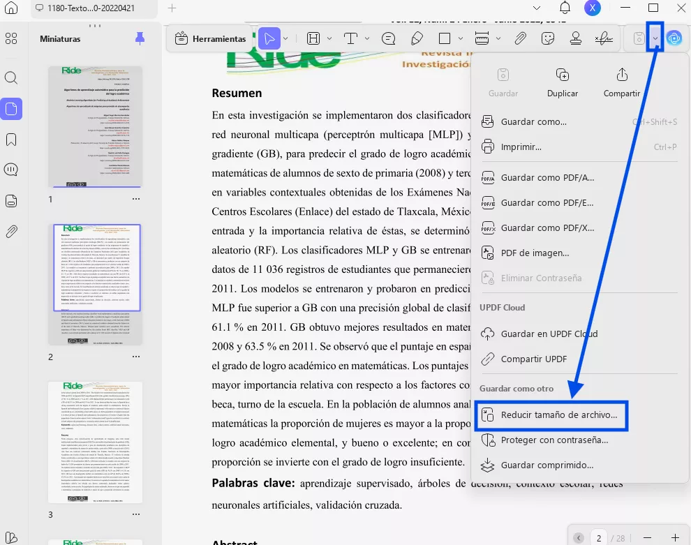 Una vez abierto el archivo, haz clic en el icono «estrecho» situado junto a «Guardar» y selecciona la función «Reducir tamaño del archivo» de entre las opciones que aparecen.