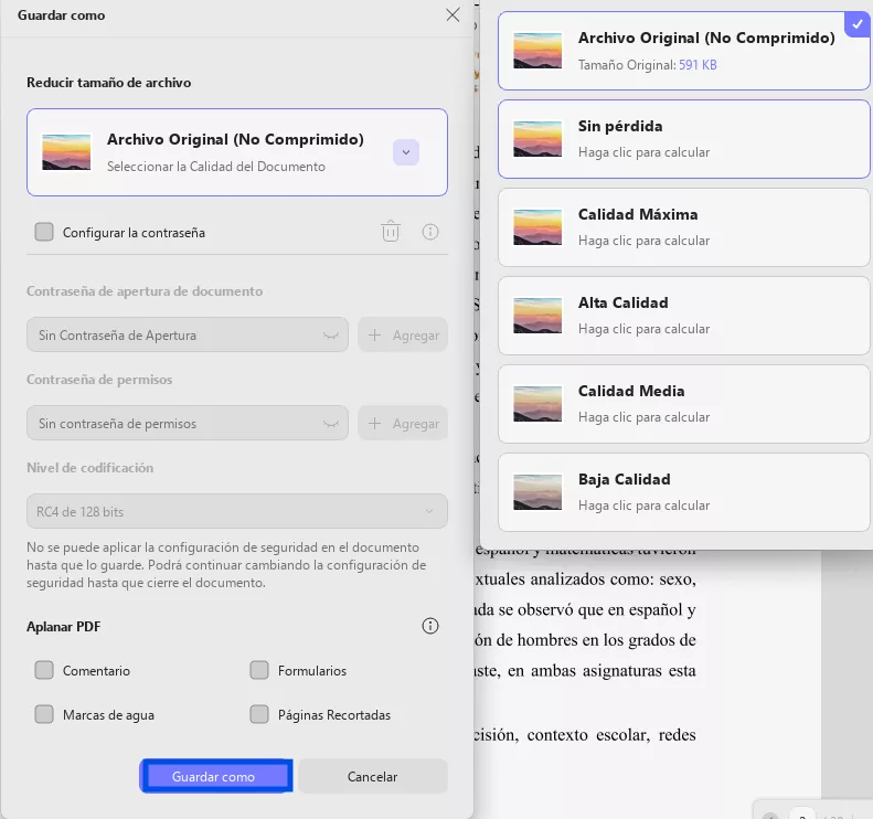 Después de elegir la calidad del documento, haga clic en el botón «Guardar como» y seleccione una ruta para guardar los archivos. Pulse «Guardar» y el archivo comprimido se guardará en su dispositivo.
