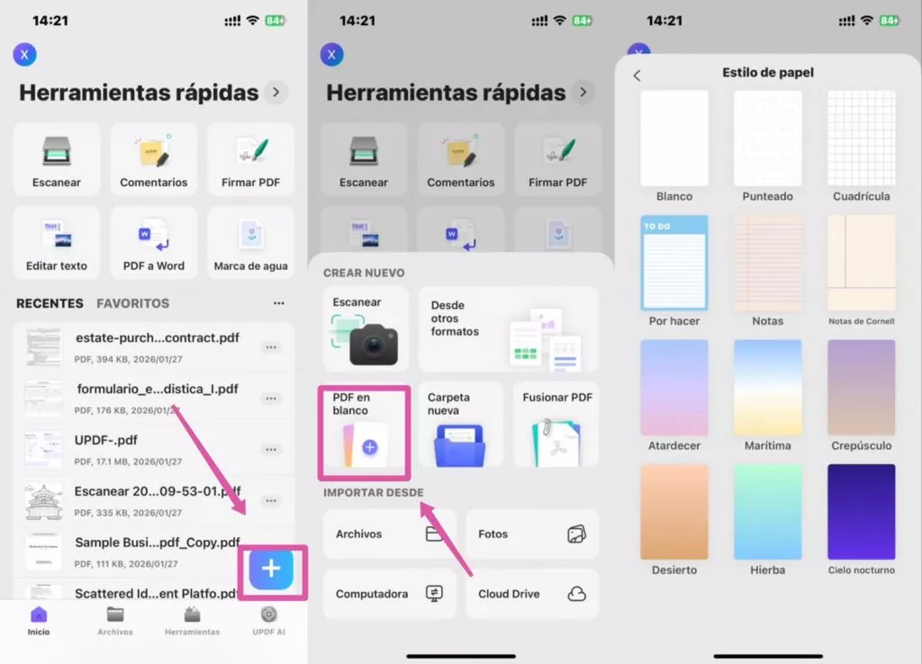 Paso 1: Abre la aplicación móvil UPDF, pulsa "+ > PDF en blanco" y selecciona el estilo de papel que deseas para tu PDF.