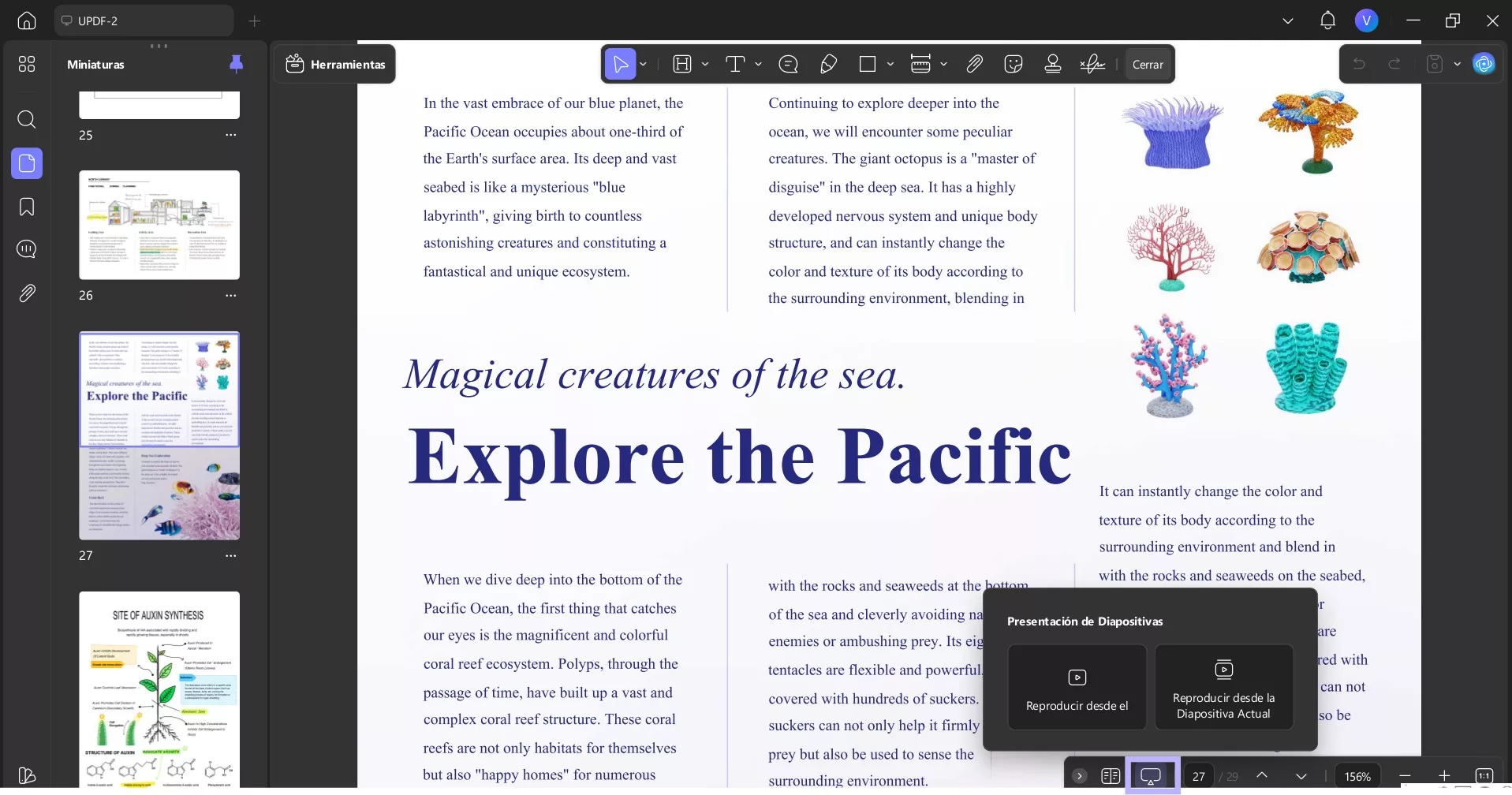 Para ver tu PDF como una presentación, simplemente haz clic en “Presentación” en la parte inferior. Luego podrás elegir entre “Reproducir desde el inicio” o “Reproducir desde la diapositiva actual”. En la parte inferior izquierda tendrás los controles para avanzar o retroceder.