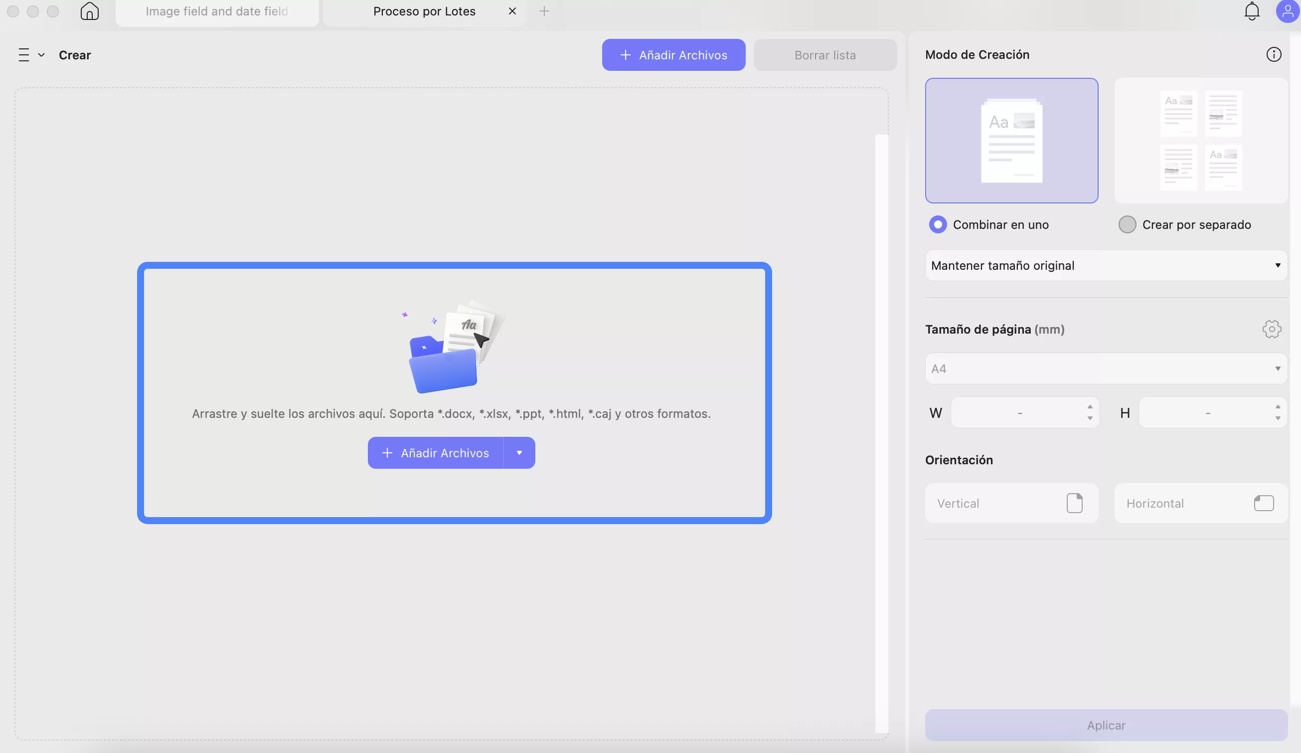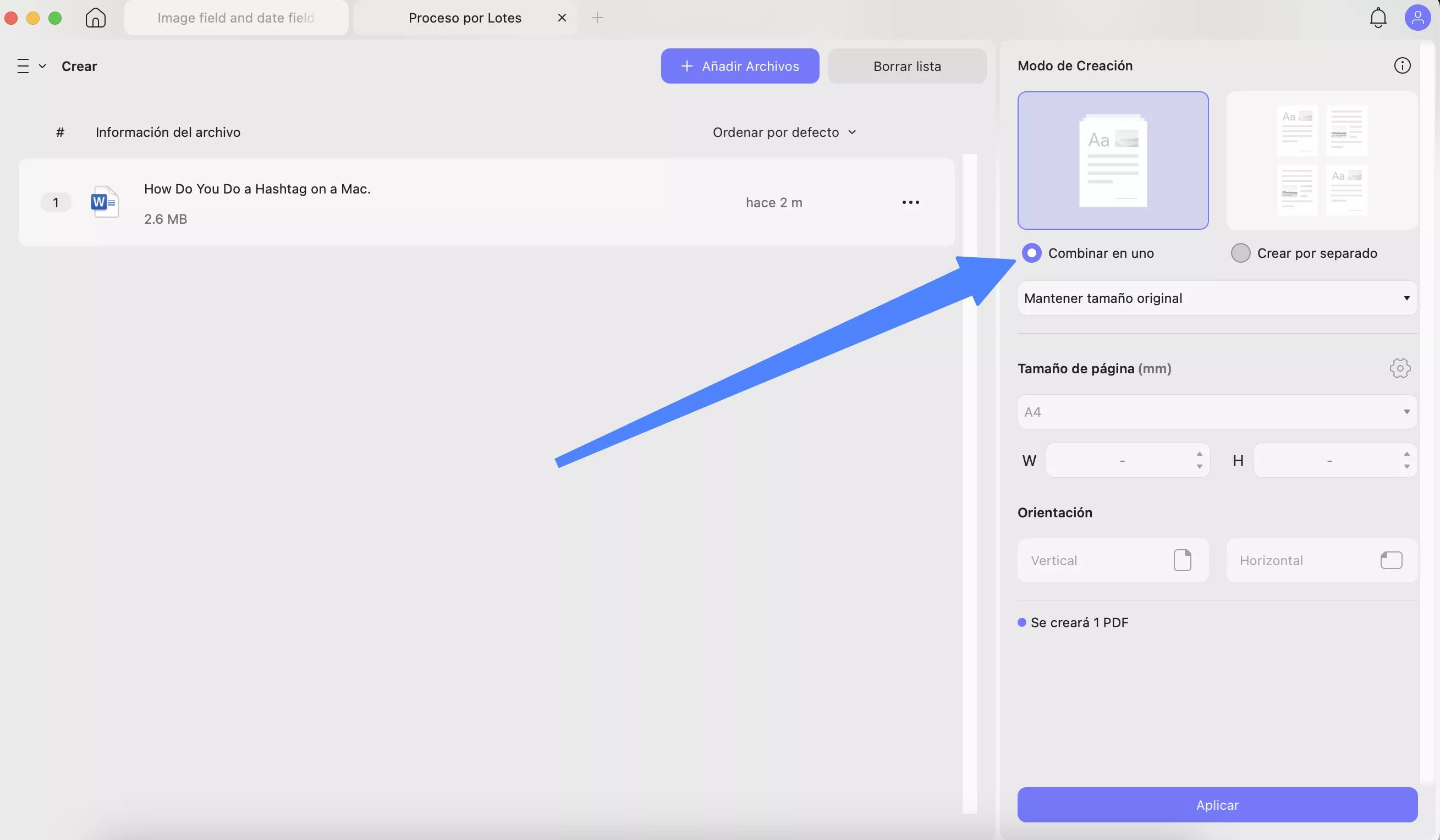 Paso 3. Después de cargar los archivos, elige entre las opciones Combinar en uno o Crear por separado según tus necesidades. Por último, ajusta la configuración del tamaño de página y pulsa Aplicar para completar la conversión por lotes.