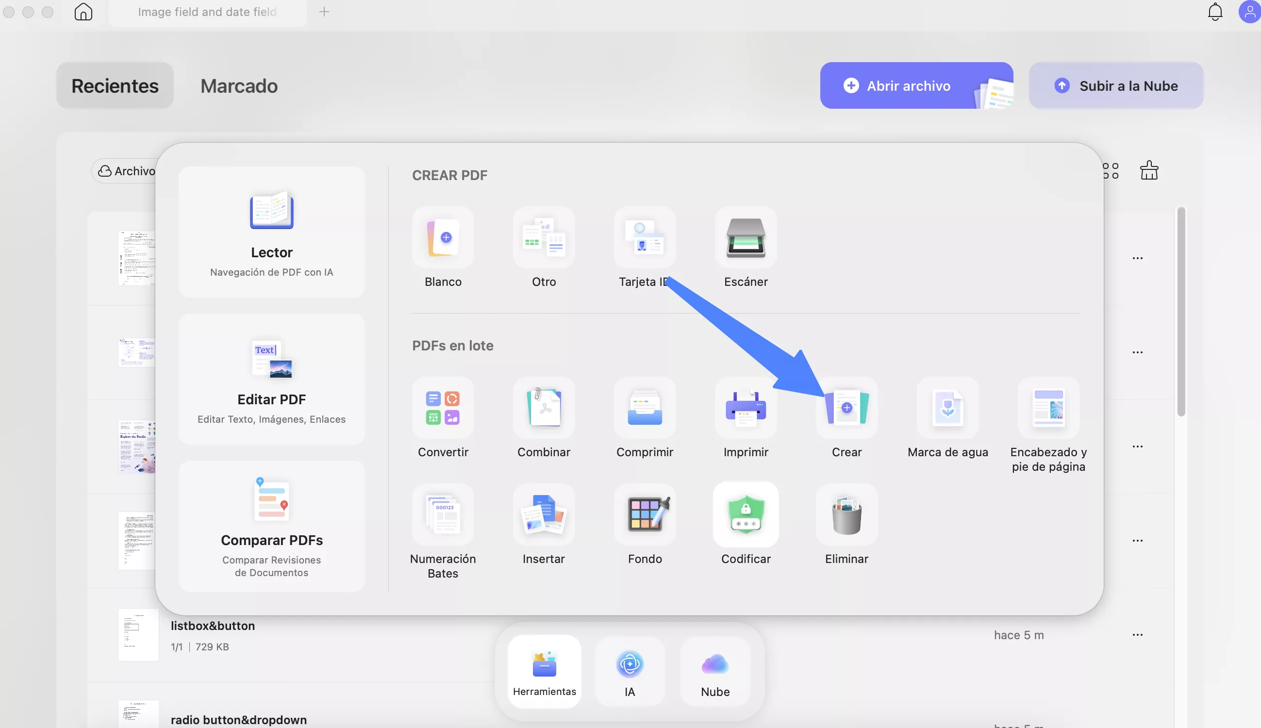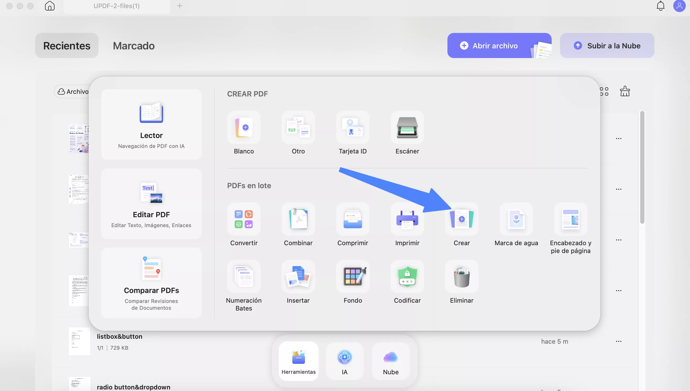 Paso 1. Al abrir UPDF, vaya a la sección Herramientas desde la pantalla principal. Ahora, seleccione la función Crear que se encuentra en la sección PDF por lotes.