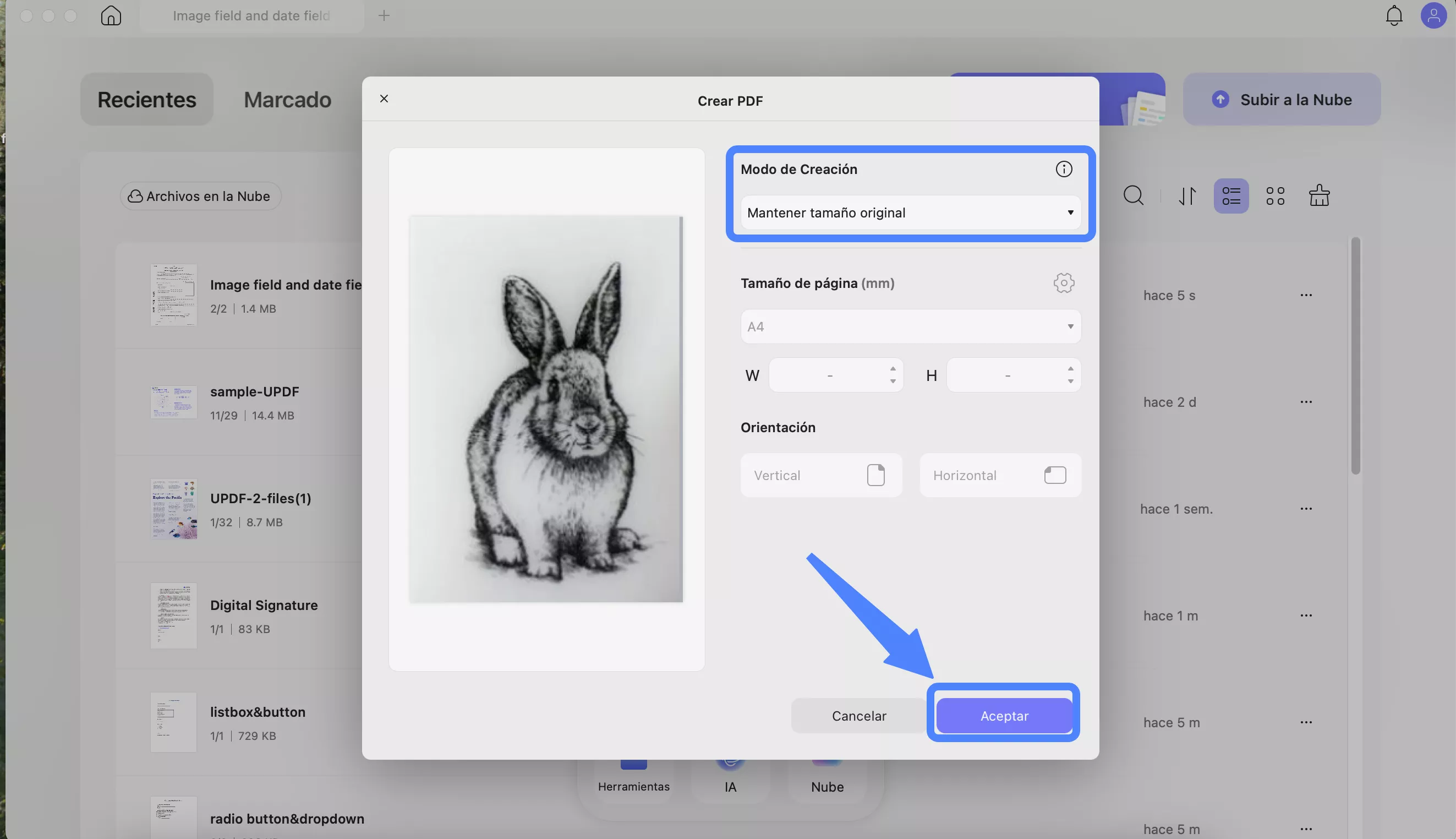 UPDF te permite crear archivos PDF a partir de diferentes formatos de archivo, incluidos algunos especializados como MOS. Incluso puedes personalizar el resultado seleccionando entre varias opciones de tamaño de página. Sigue los pasos que se indican a continuación para aprender a convertir tu archivo MOS a PDF con UPDF.