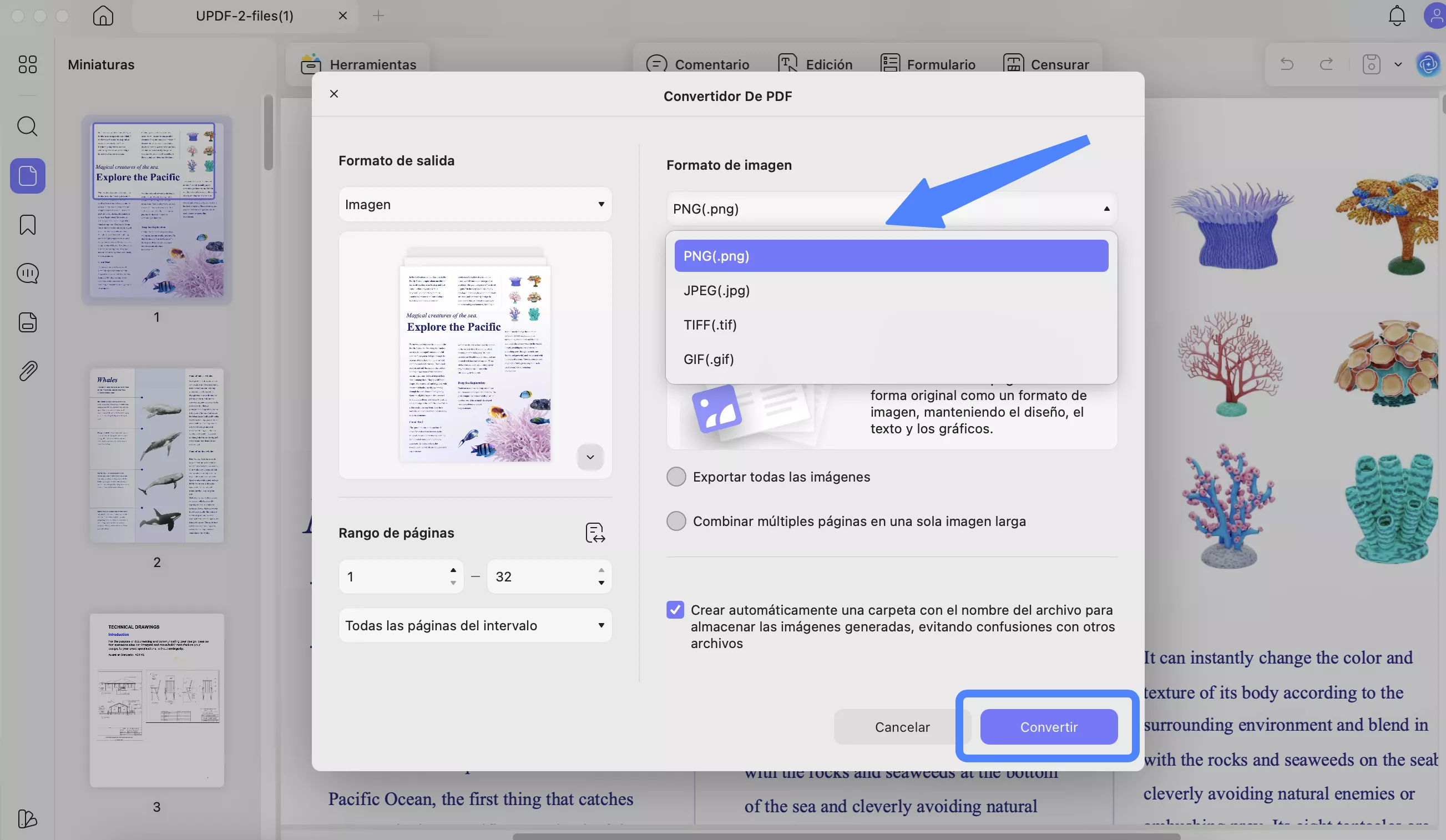 Como se ha mencionado, UPDF incluso te permite convertir archivos MOS a otros formatos de imagen. Para ello, primero tienes que crear un PDF a partir de archivos MOS utilizando la sencilla función de creación o creación por lotes. Una vez creado el archivo PDF, puedes obtener cualquier formato deseado, incluyendo PNG, JPG y TIFF.