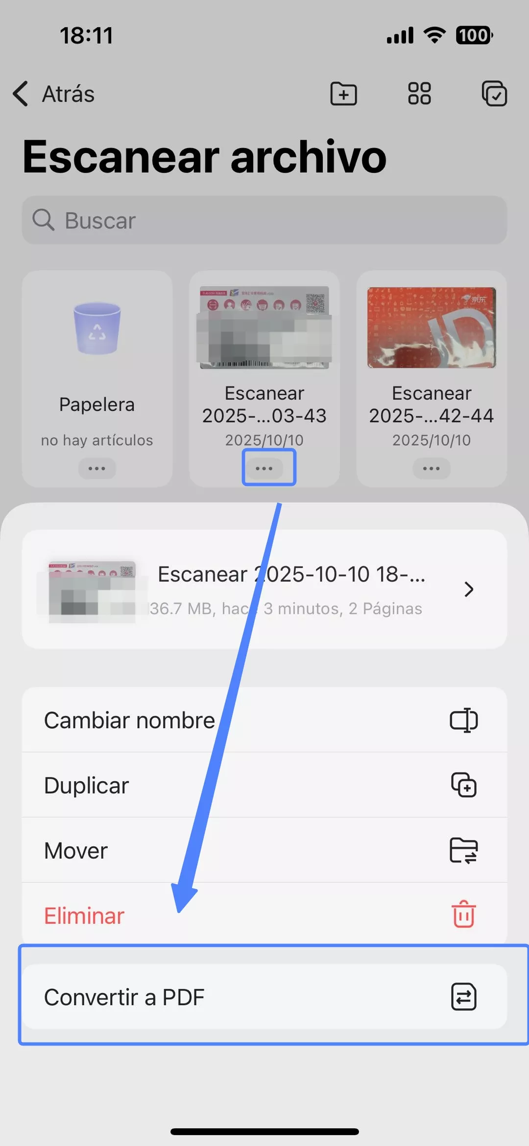 5. Toca los tres puntos “…” sobre la foto. En el menú que aparece, selecciona “Convertir a PDF”.
