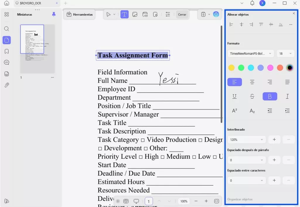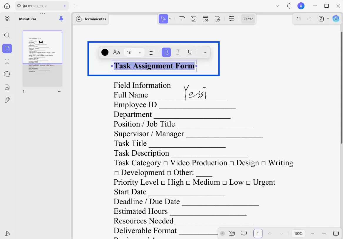 Utilizando el botón «Comentario» de «Herramientas», haz doble clic en cualquier campo de texto para que sea editable en el documento PDF. Cuando veas que el texto es editable, podrás modificar la fuente, el tamaño y el estilo del texto, añadir o eliminar texto sin afectar al resto de la página, y mucho más.