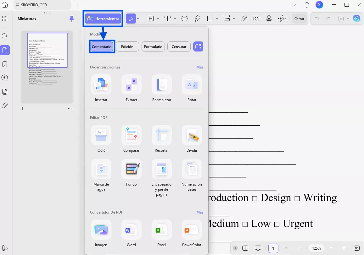 Si deseas anotar un extracto bancario añadiendo dibujos a lápiz, comentarios en cuadros de texto o resaltando texto en el PDF, haz clic en la opción «Comentario» y selecciona la herramienta que necesites.