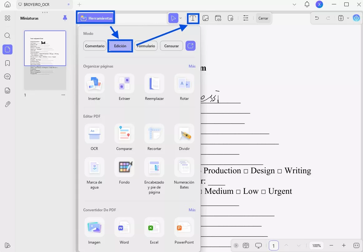 Para empezar, ve a la opción «Herramientas», situada en la esquina superior derecha de la interfaz. A continuación, selecciona la opción «Editar» > «Insertar y editar texto» entre las opciones disponibles.