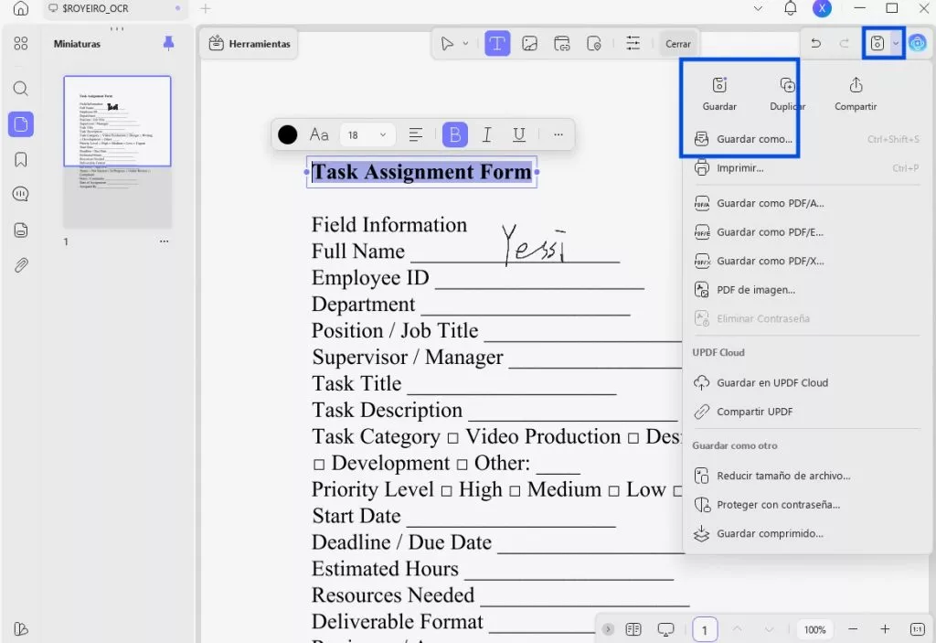 Una vez realizadas todas las modificaciones, haz clic en «Guardar como...» para guardar todos los cambios en un nuevo archivo PDF sin alterar el original. O bien, utiliza la opción «Guardar» para guardar todos los cambios en el archivo original.