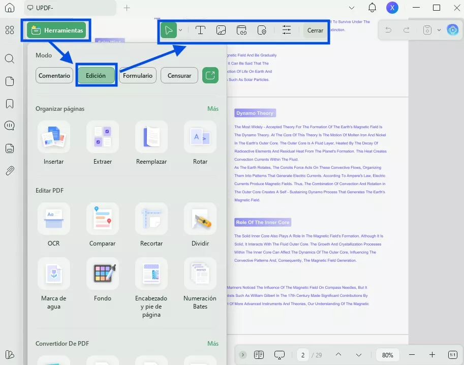 Para ello, puede utilizar el icono "Abrir archivo" de la página de bienvenida de UPDF. Para cambiar el tamaño de la fuente de su documento PDF, deberá entrar en el modo de edición. Para ello, solo tiene que hacer clic en la pestaña "Editar" de "Herramientas", situada en la barra de herramientas izquierda de la interfaz de UPDF.