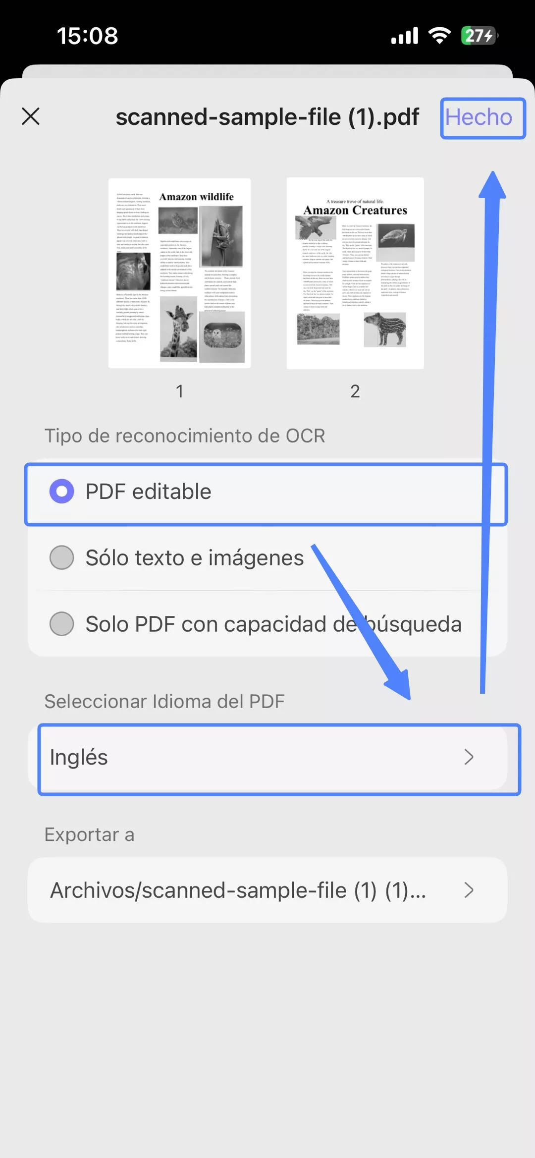 Paso 2. Elige PDF editable, selecciona el idioma del PDF y luego pulsa el botón "Listo" para convertir el PDF escaneado en editable. Después, abre el PDF editable y toca en editar para modificar el texto del PDF.