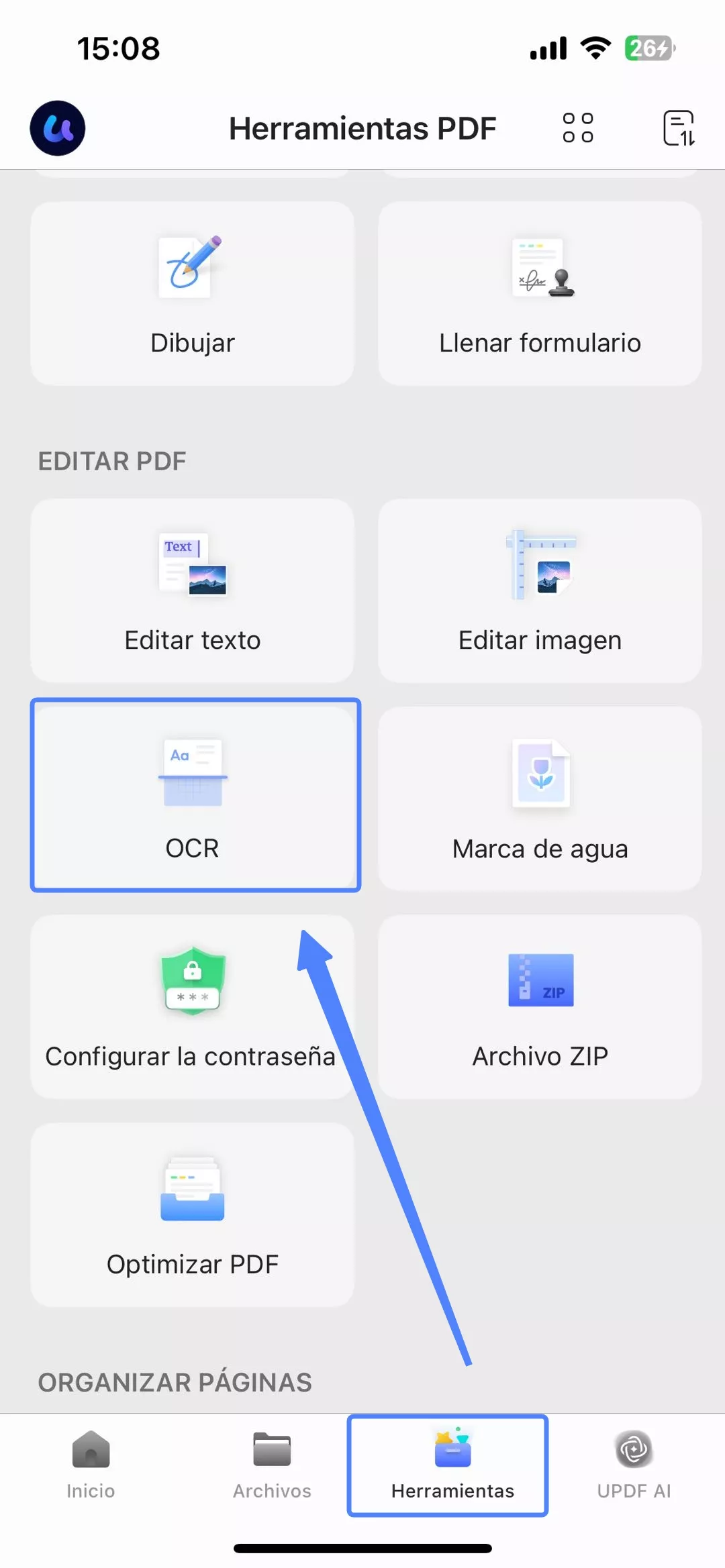 Paso 1. Abre UPDF en tu móvil. Haz clic en "Herramientas" > "OCR".