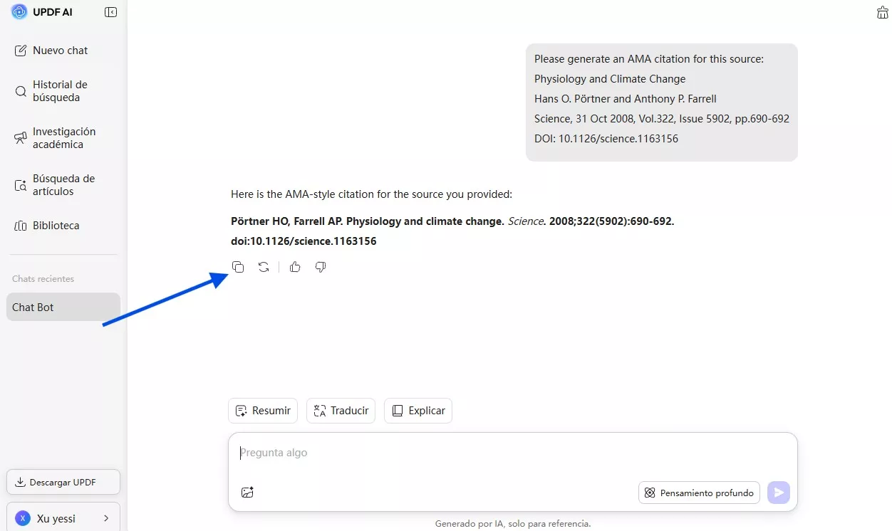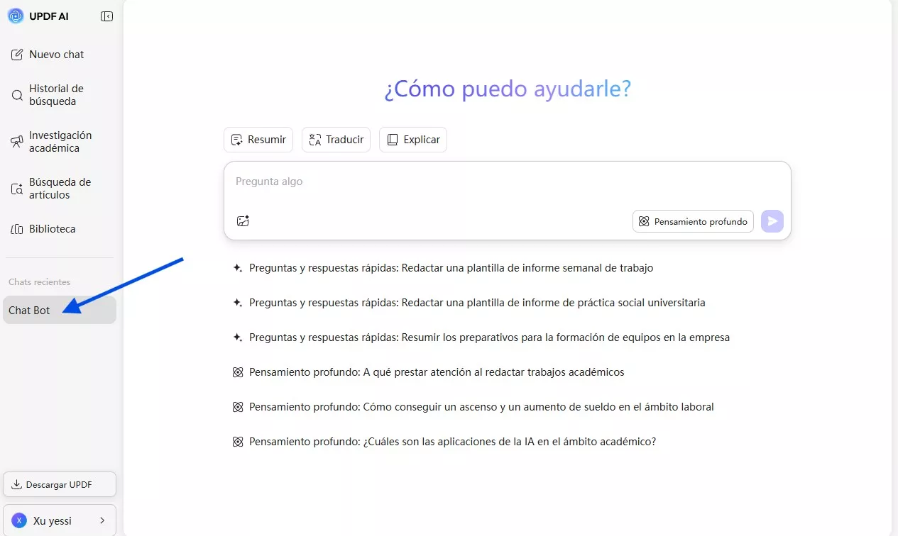 Una vez que accedas a la interfaz principal, haz clic en la opción «Chatbot» del panel izquierdo. En esta función de chat, puedes plantear cualquier pregunta o duda, salvo las relacionadas con la generación de citas bibliográficas.