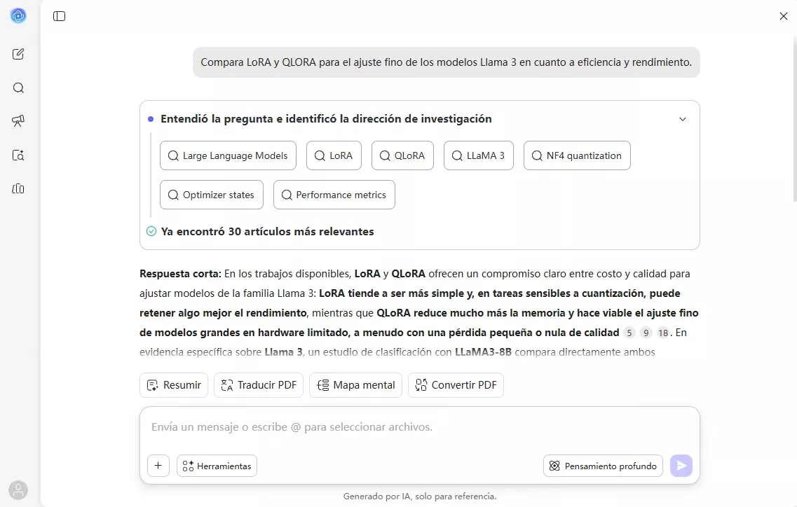 3. Chatea con archivos PDF: Puedes subir archivos PDF y plantear preguntas sobre los métodos, los resultados o secciones concretas de los mismos. La IA destaca los pasajes clave, lo que reduce el desplazamiento por la pantalla y te ayuda a extraer información útil más rápidamente.