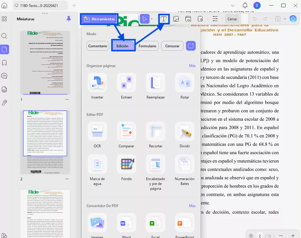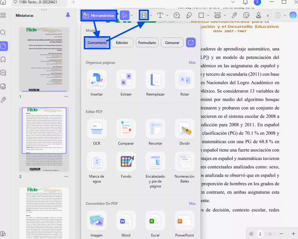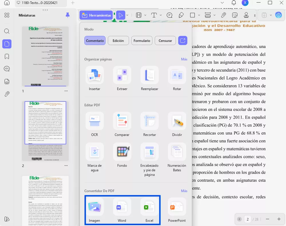 En la barra de herramientas de la derecha, haga clic en el icono «Herramientas» y busque «Convertidor de PDF». Puede seleccionar el formato deseado, como «Imagen», «Word» y «Excel».