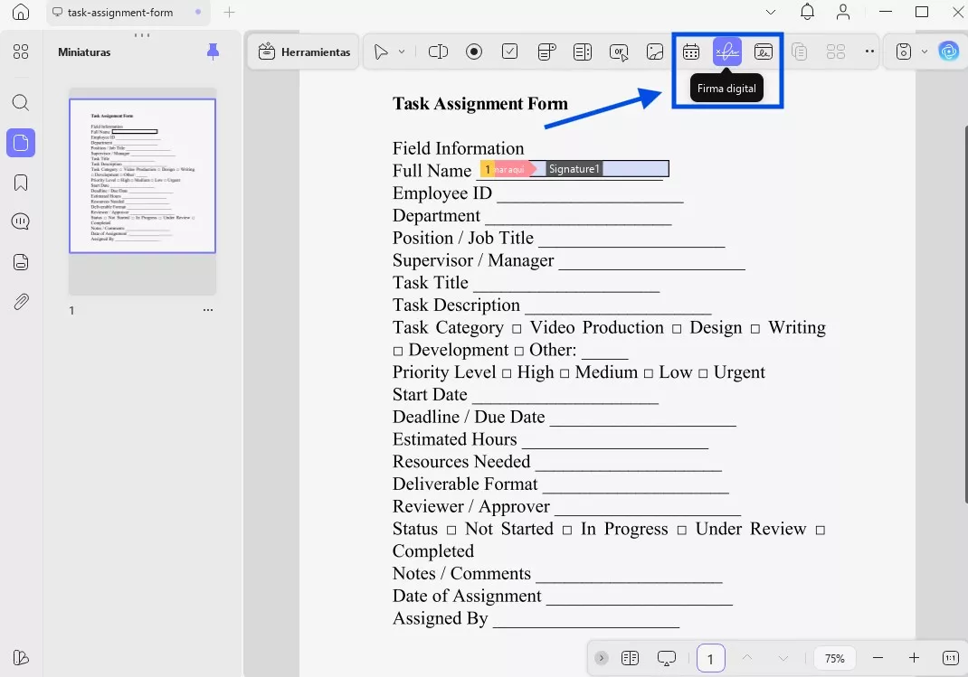 Cuando el archivo esté ahí, accede al modo «Formulario» desde «Herramientas». A continuación, selecciona la opción «Firma digital» en la lista de herramientas mencionada anteriormente y elige el lugar donde deseas insertar las firmas.