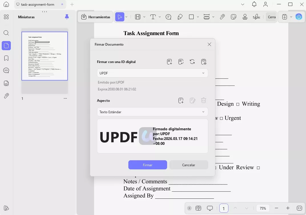 Además de las herramientas integradas, los usuarios también pueden recurrir a programas de escritorio como UPDF para insertar firmas digitales en Excel. Al añadir la firma digital, esta herramienta ofrece la opción de crear una nueva firma o importar una ya existente. Además de añadir firmas digitales, los usuarios pueden incluir campos de texto y casillas de verificación en sus formularios para facilitar la recopilación de datos.