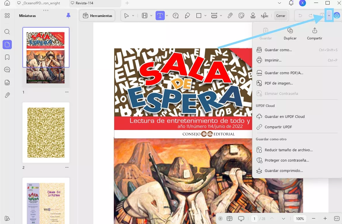 Paso 4: Cuando termines de leer y quieras guardar tus notas y anotaciones, haz clic en la "Flecha hacia abajo" en la esquina superior derecha y elige cómo te gustaría guardar tu PDF.