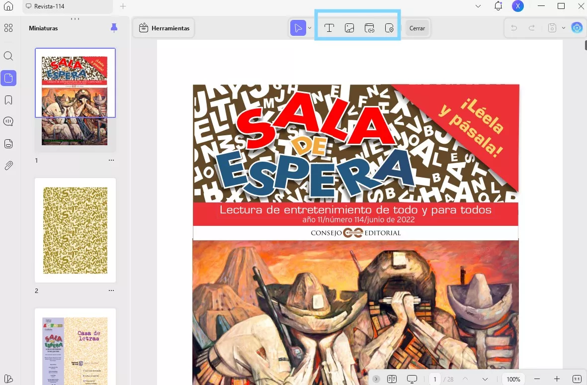 Paso 1: Abre UPDF y sube el ebook en PDF que descargaste. Desde el menú superior, puedes agregar texto, una imagen o un enlace.