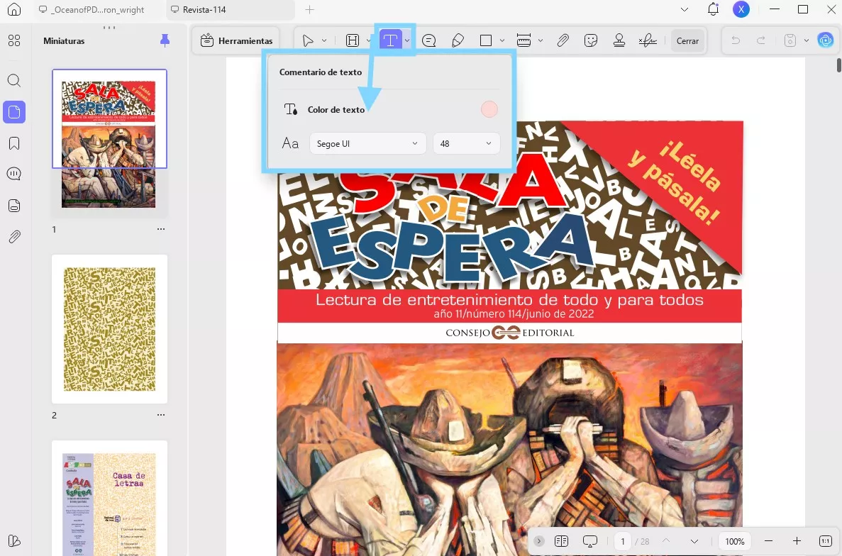 Paso 2: También puedes anotar tu ebook en PDF. Desde el lado izquierdo, selecciona "Comentarios". En la parte superior de la pantalla, haz clic en el ícono de "T" y ahora tendrás muchas opciones para anotar tu ebook en PDF, incluyendo agregar una nota adhesiva, resaltar texto, subrayar texto y más.
