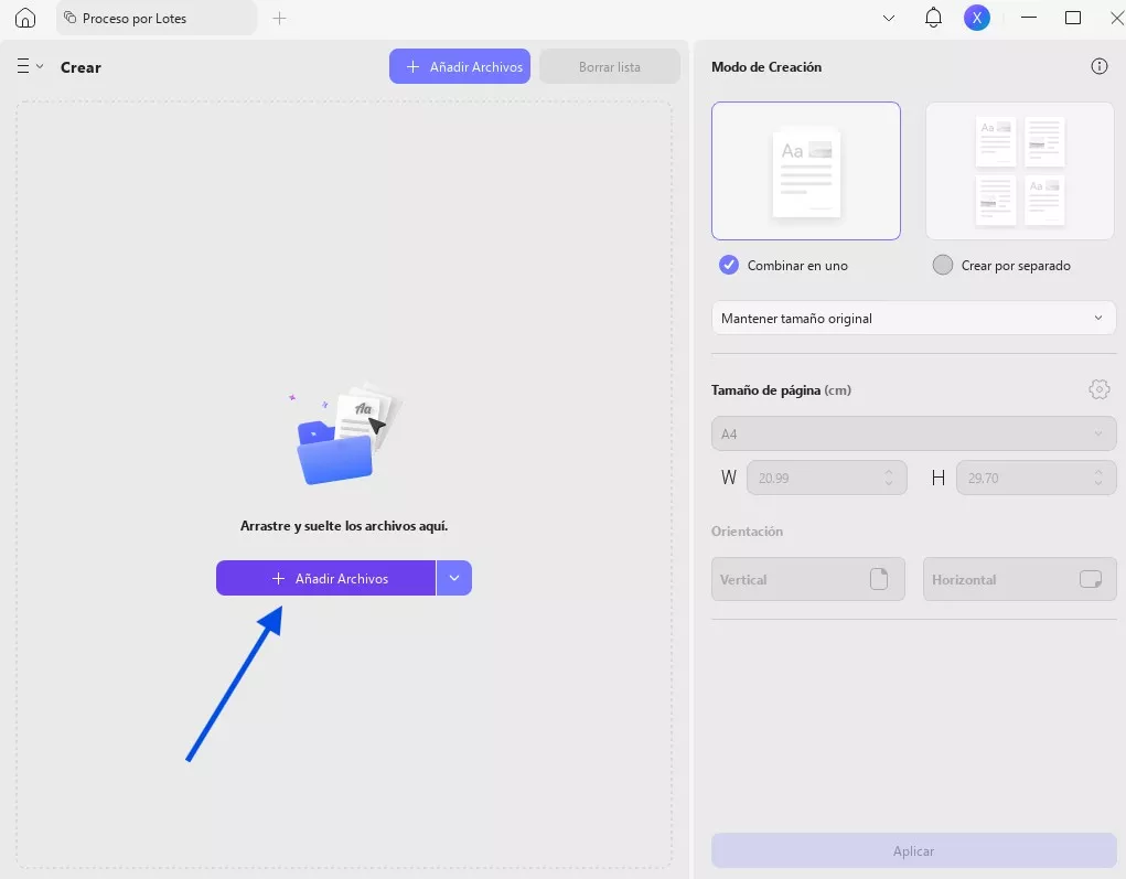 Seleccione «Añadir archivos» para importar sus documentos en la nueva página que se abre. En la parte derecha de la pantalla, puede combinar los archivos en un único PDF o crear varios documentos a partir de los archivos importados.