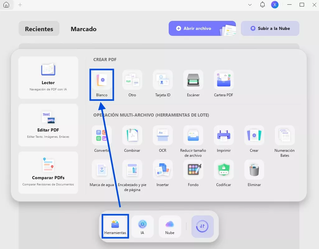 Comience por iniciar la aplicación UPDF. A continuación, haga clic en «Herramientas» en la parte inferior izquierda, vaya a «CREAR PDF» y seleccione «Otro». Si desea crear un nuevo documento, haga clic en «En blanco».