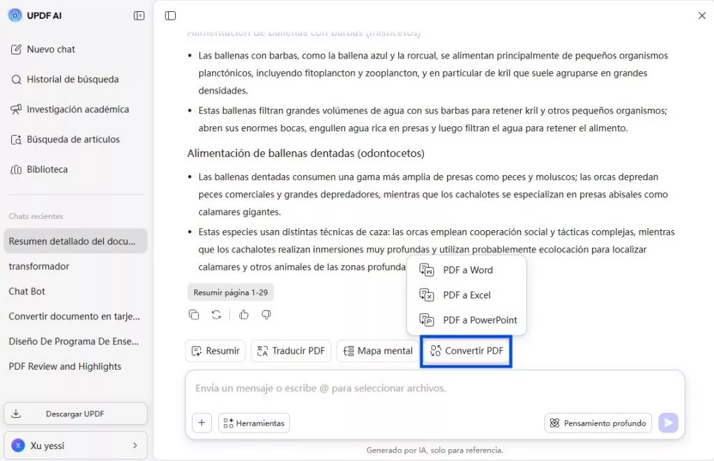 - Integración basada en IA: una vez creado el PDF, UPDF AI puede resumir, traducir o explicar el contenido al instante, lo que supone un enorme salto en productividad con respecto a los convertidores tradicionales.