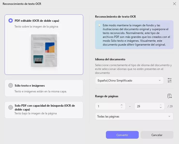 Paso 2. Una vez abierto el archivo PDF, verá un panel de herramientas en la parte derecha de la pantalla. Haga clic en la opción «OCR» en «Herramientas». Aparecerá una ventana emergente con opciones para que funcione el OCR. Puede elegir «Configuración de diseño» para seleccionar si desea mantener el diseño como texto original o no. Especifique el «Idioma del documento», debe elegir el idioma que coincida con su documento original y establecer el «Rango de páginas» según sus necesidades. Una vez realizadas las selecciones, pulse el botón «Convertir» y UPDF realizará el OCR y le pedirá que guarde el archivo de salida.