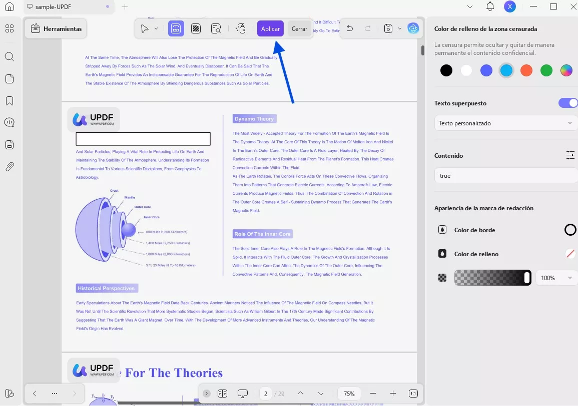 Paso 4. También puedes personalizar las propiedades de censura o utilizar las opciones de «Censurar páginas» de la parte superior para realizar censuras más específicas. Una vez hecho esto, haz clic en el botón «Aplicar» para aplicar la censura de forma permanente.
