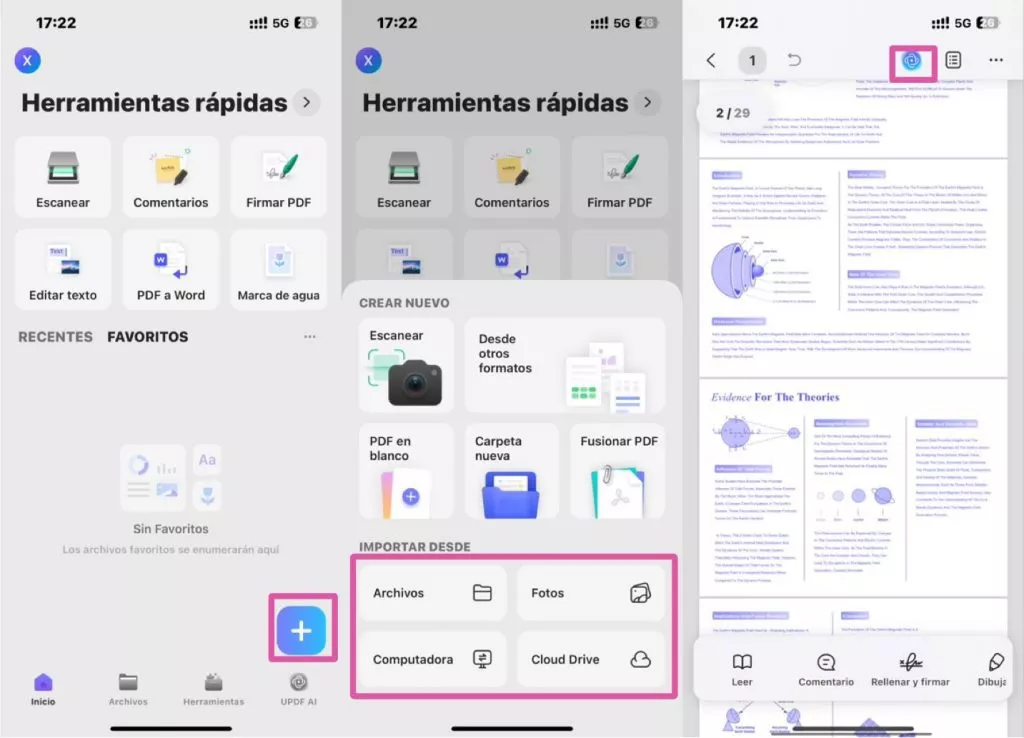 Abre la aplicación UPDF en tu teléfono. Haz clic en el botón «+» e importa el PDF que deseas resumir. Puedes acceder a él desde UPDF Cloud o subir uno nuevo a UPDF.