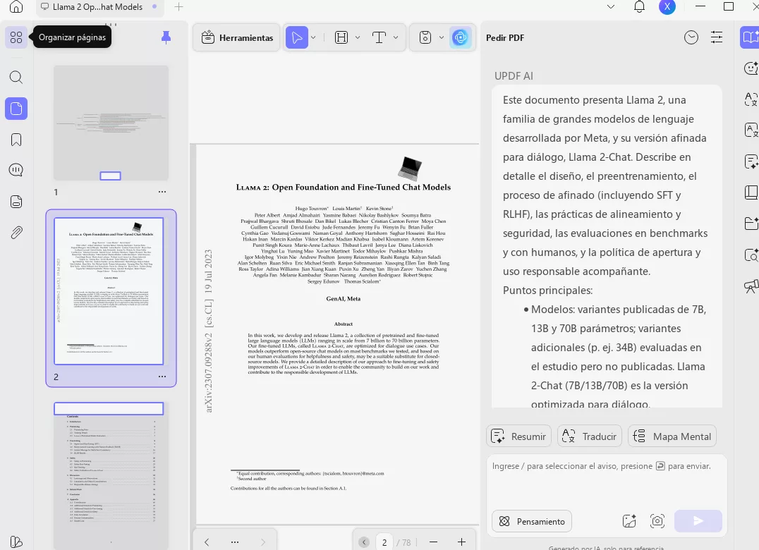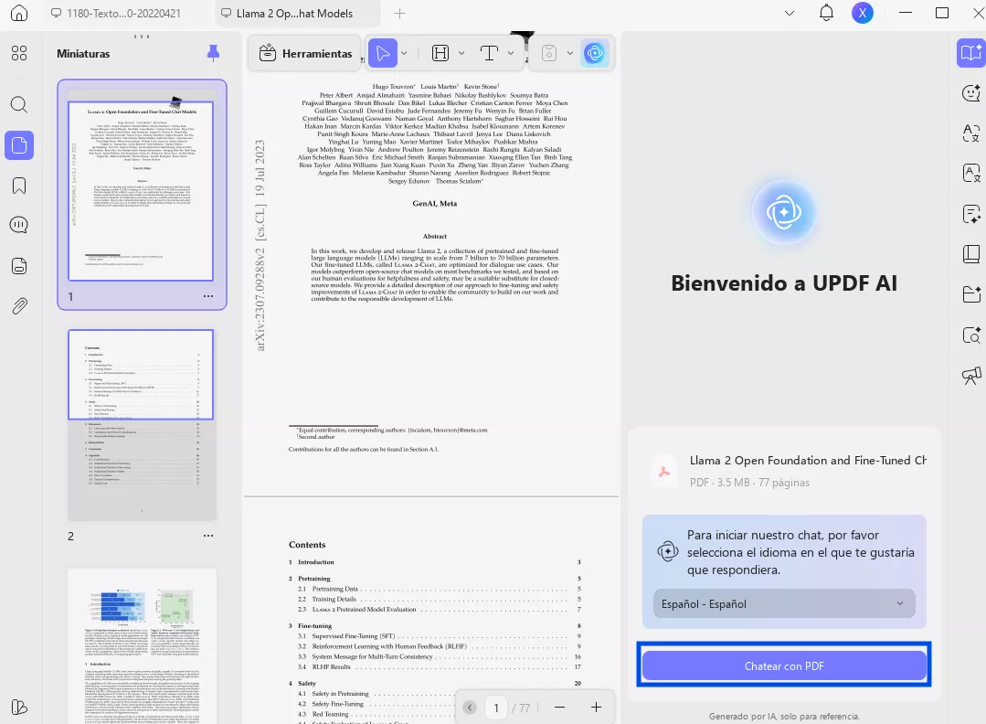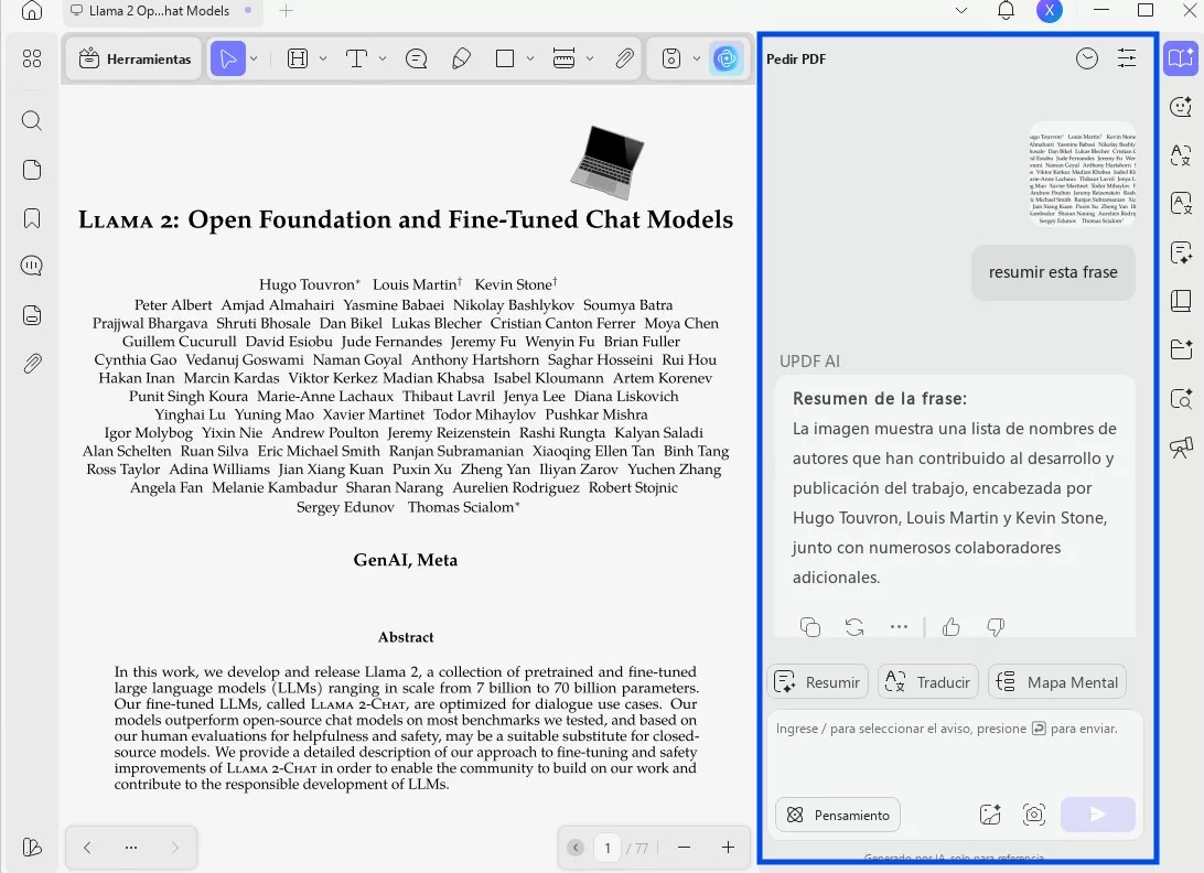 UPDF AI tiene la capacidad de detectar automáticamente el tipo de documento que has subido. Cuando subes un PDF estándar, UPDF AI generará un resumen más conciso. En cambio, para los documentos PDF de investigación, genera resúmenes con detalles clave como título, autores, afiliaciones, palabras clave, URL y contenido estructurado.