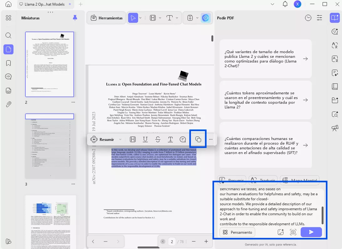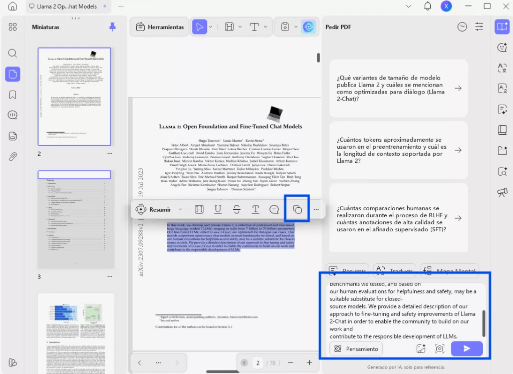 Después de abrir un PDF en esta herramienta, selecciona el texto adecuado en el modo «Lector» para acceder a una barra de menú emergente. Desde aquí, haz clic en el icono «Copiar texto» y «Pégalo» en el cuadro «Preguntar algo».