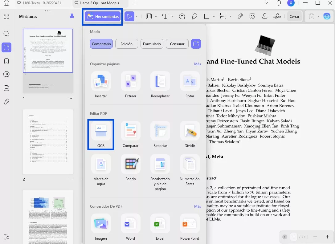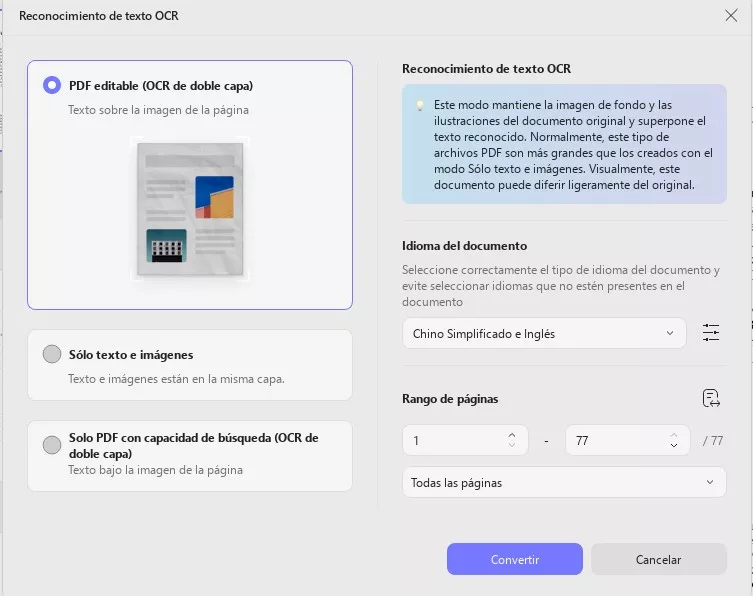 Una vez abierto el PDF, haga clic en «Herramientas» y seleccione «OCR» entre las opciones. A continuación, seleccione «Tipo de documento», «Idioma del documento» y «Rango de páginas».