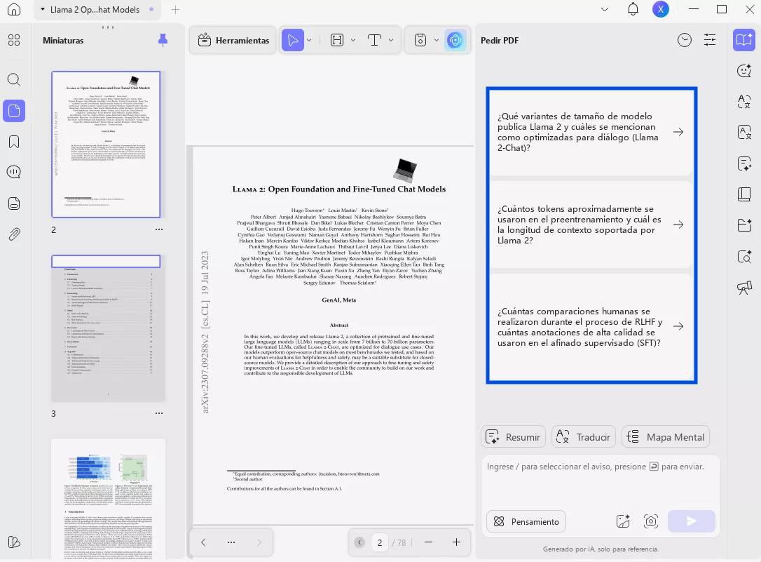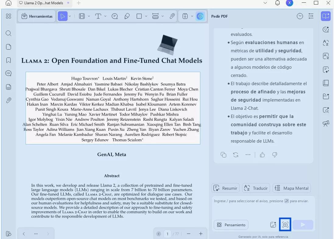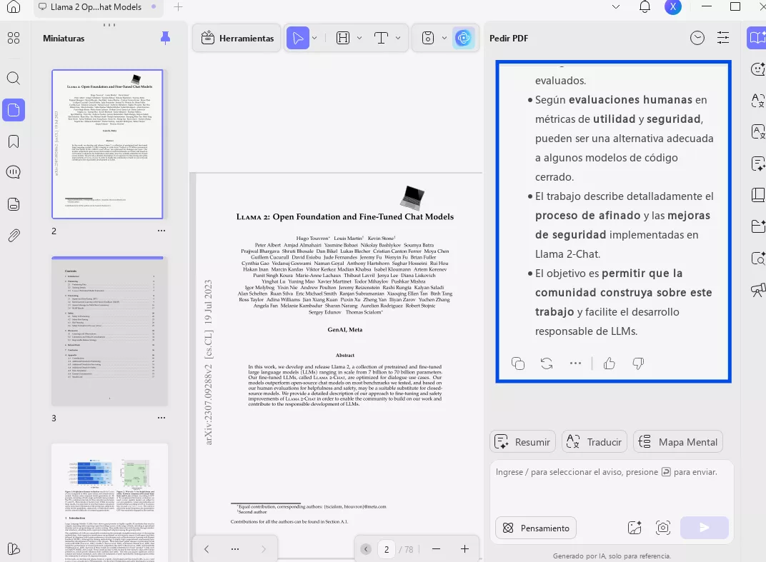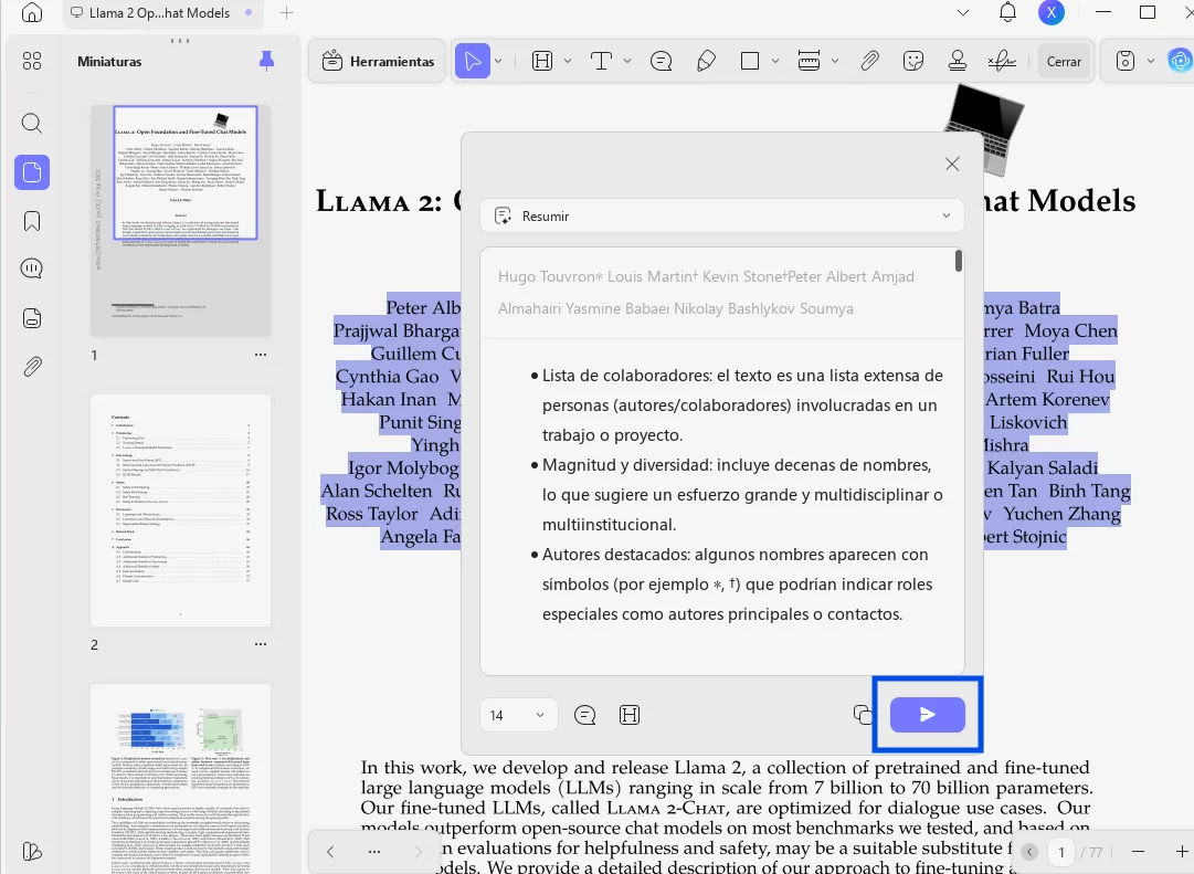 Al cargar el documento, la herramienta de IA genera automáticamente un resumen del documento completo. Después de leerlo, puede seleccionar la opción «Resumir» en las pestañas situadas encima del cuadro de texto.