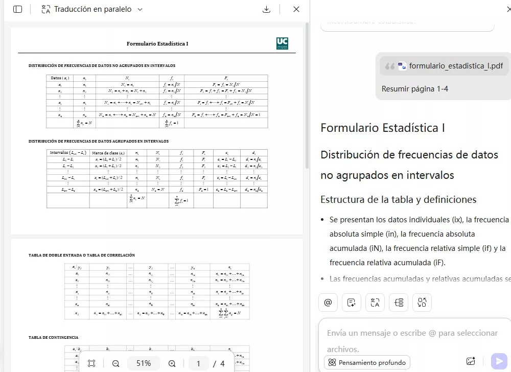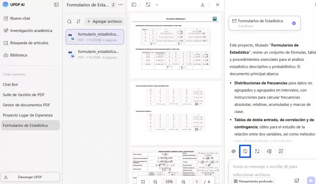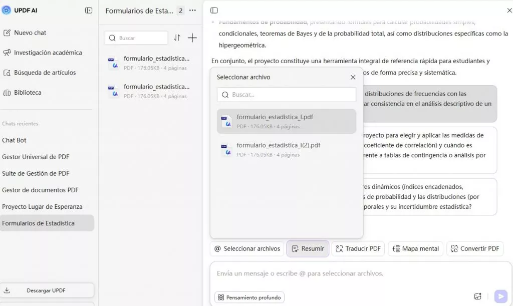 Mientras visualiza un PDF, también puede hacer clic en el icono «@» de la interfaz de chat y seleccionar el archivo que desea abrir. A continuación, podrá comparar los resúmenes de ambos archivos en paralelo.