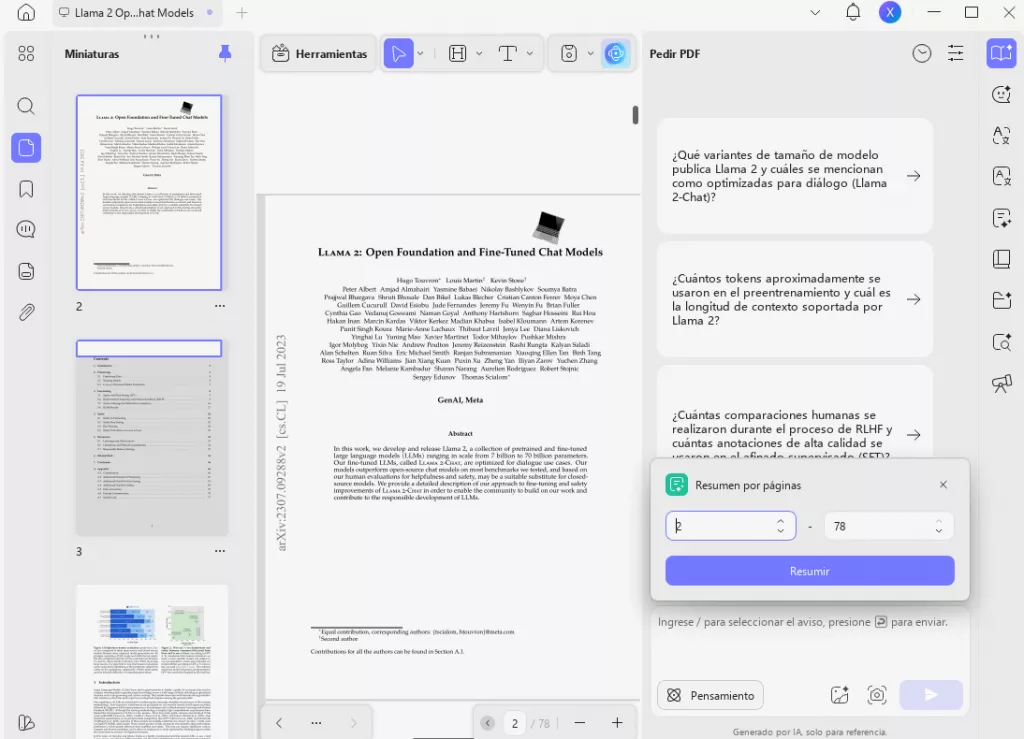 En el modo Preguntar, después de hacer clic en «Comenzar», puede hacer clic en el botón «Resumir», seleccionar el rango de páginas que desea resumir y hacer clic en el botón «Resumir» para comenzar a resumir el PDF por páginas.