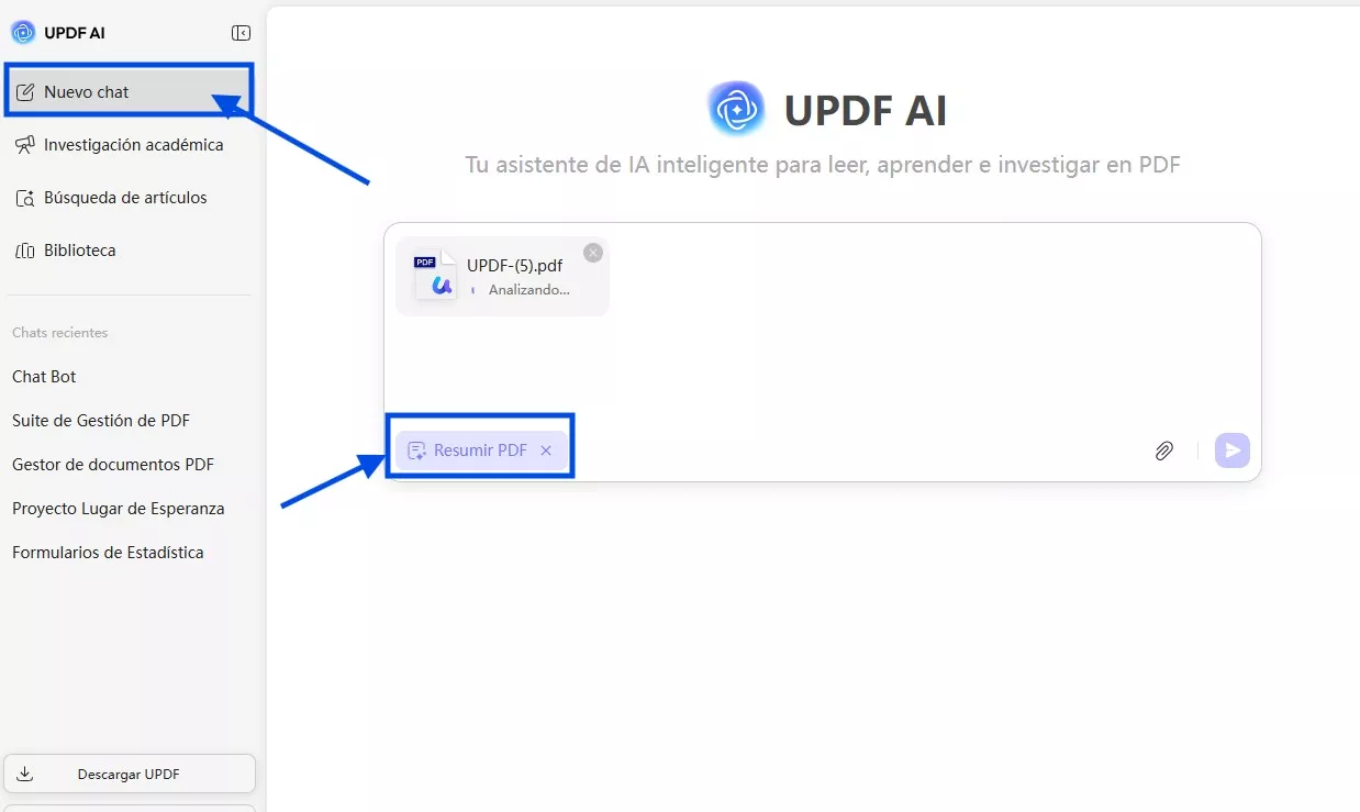Inicie el procedimiento accediendo a la interfaz principal de la función «Nuevo chat» de UPDF AI. A continuación, seleccione la opción «Resumir PDF» y cargue el PDF que desea resumir.