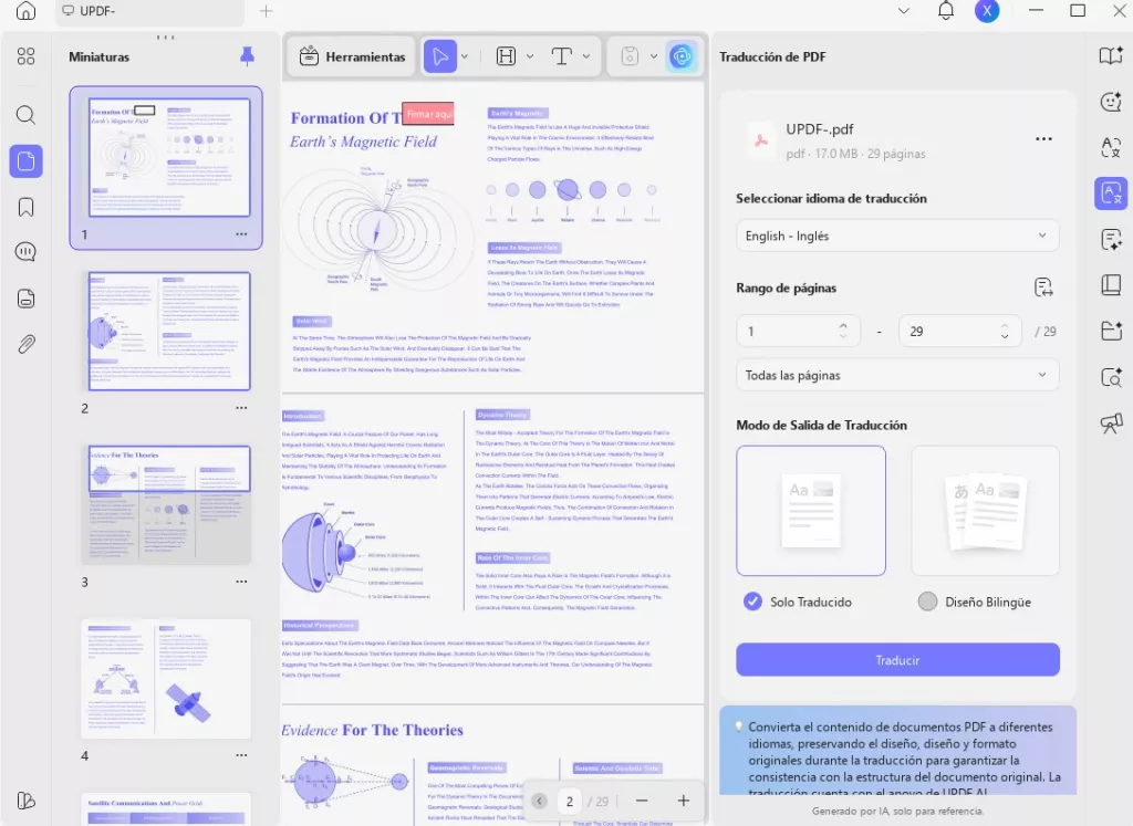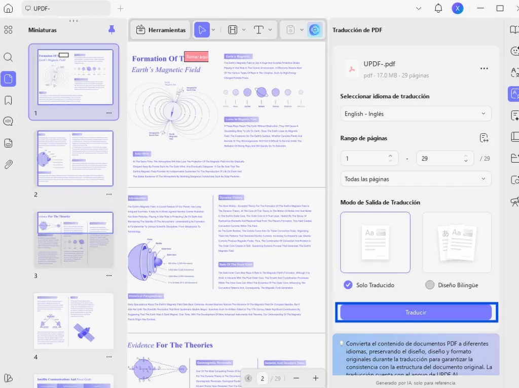 En pocas palabras, obtendrá un PDF traducido completo con la misma estructura, estilo y formato que el documento original. Esta función también le permite traducir solo páginas específicas del PDF. Con múltiples métodos de traducción y compatibilidad con archivos PDF escaneados, UPDF está diseñado para satisfacer diversas necesidades.
