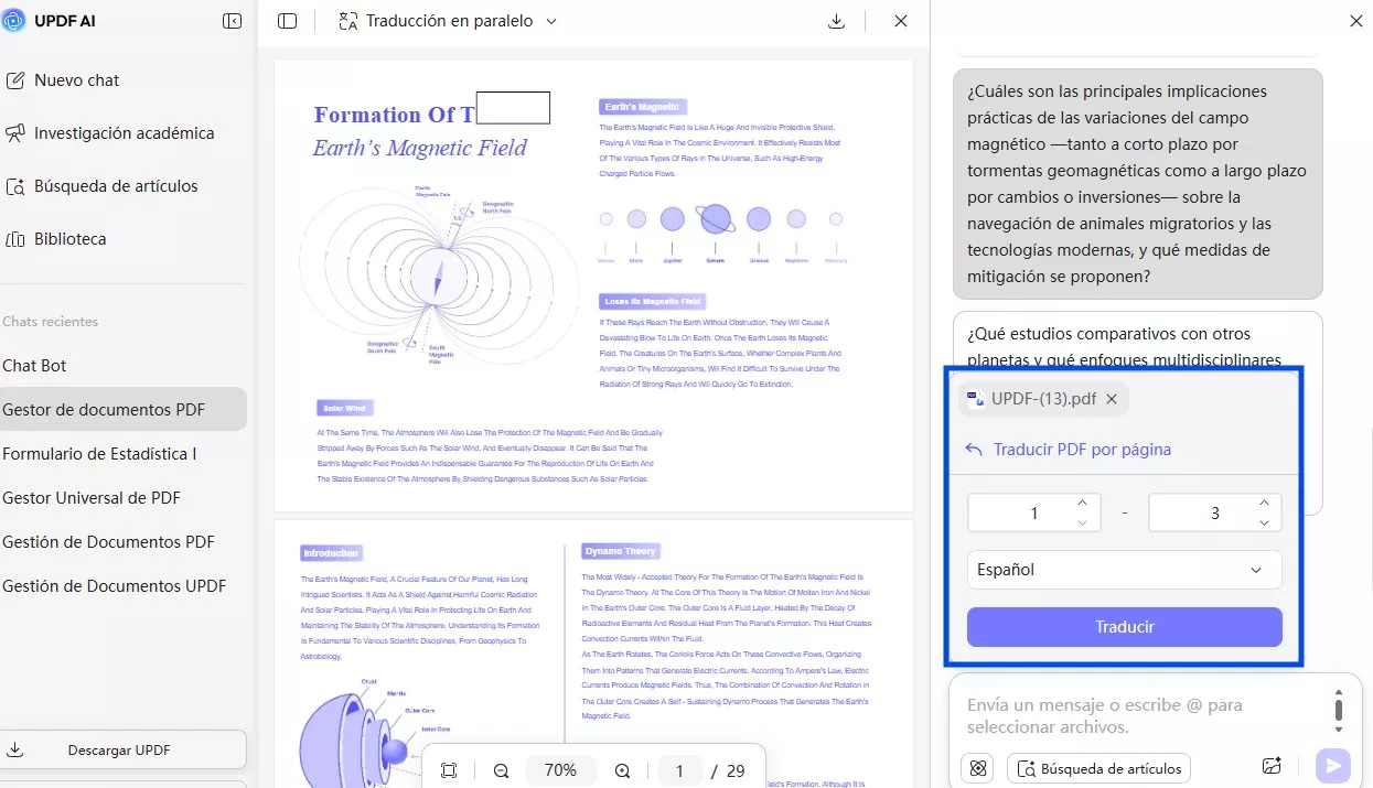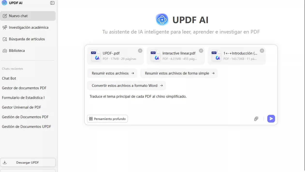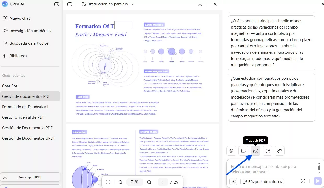 Imagínese que acaba de recibir un manual de usuario en formato PDF o un documento de contrato comercial en un idioma extranjero. Aquí es donde la función de traducción con tecnología de inteligencia artificial avanzada de UPDF ofrece una forma sencilla de traducir archivos PDF sin comprometer su estructura original. Además, obtiene un potente asistente de inteligencia artificial para resumir, traducir, explicar y tener un chat de inteligencia artificial con los archivos PDF.