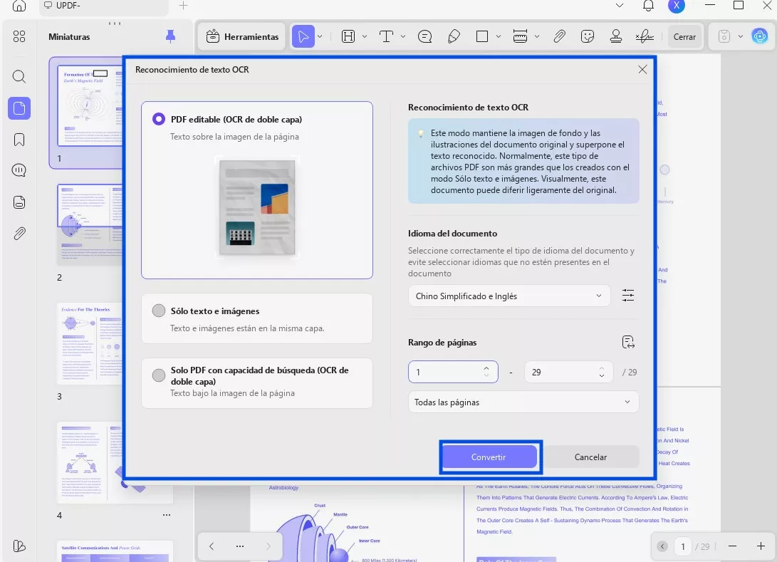 A continuación, seleccione el «Tipo de documento» y el «Idioma del documento» del PDF. Seleccione el «Rango de páginas» y haga clic en el botón «Convertir». UPDF realizará el OCR y hará que el contenido del documento sea editable.